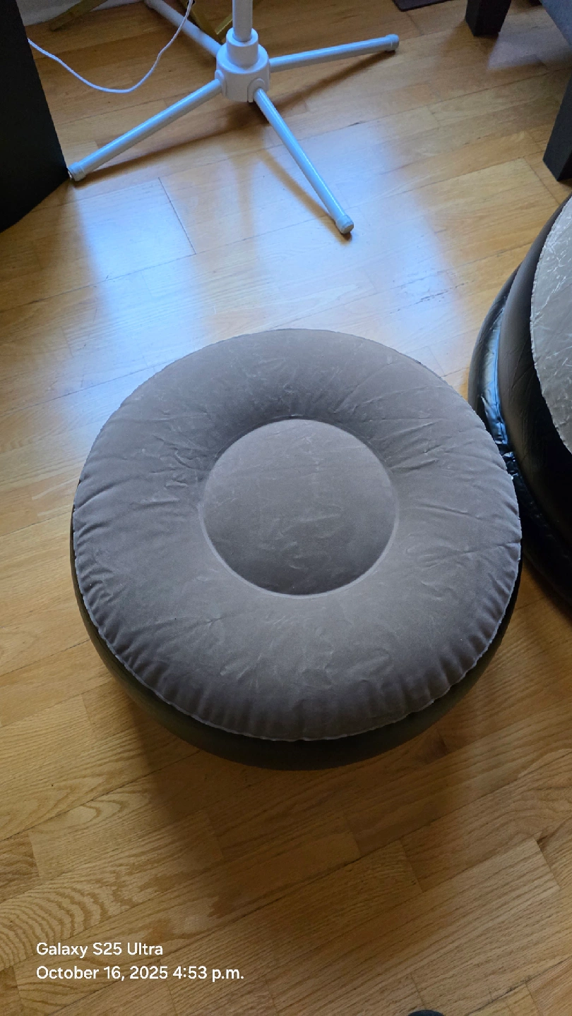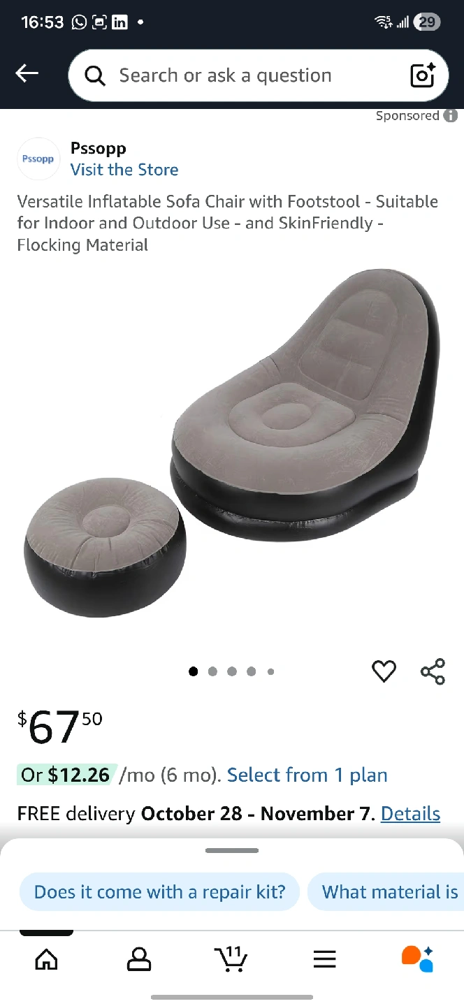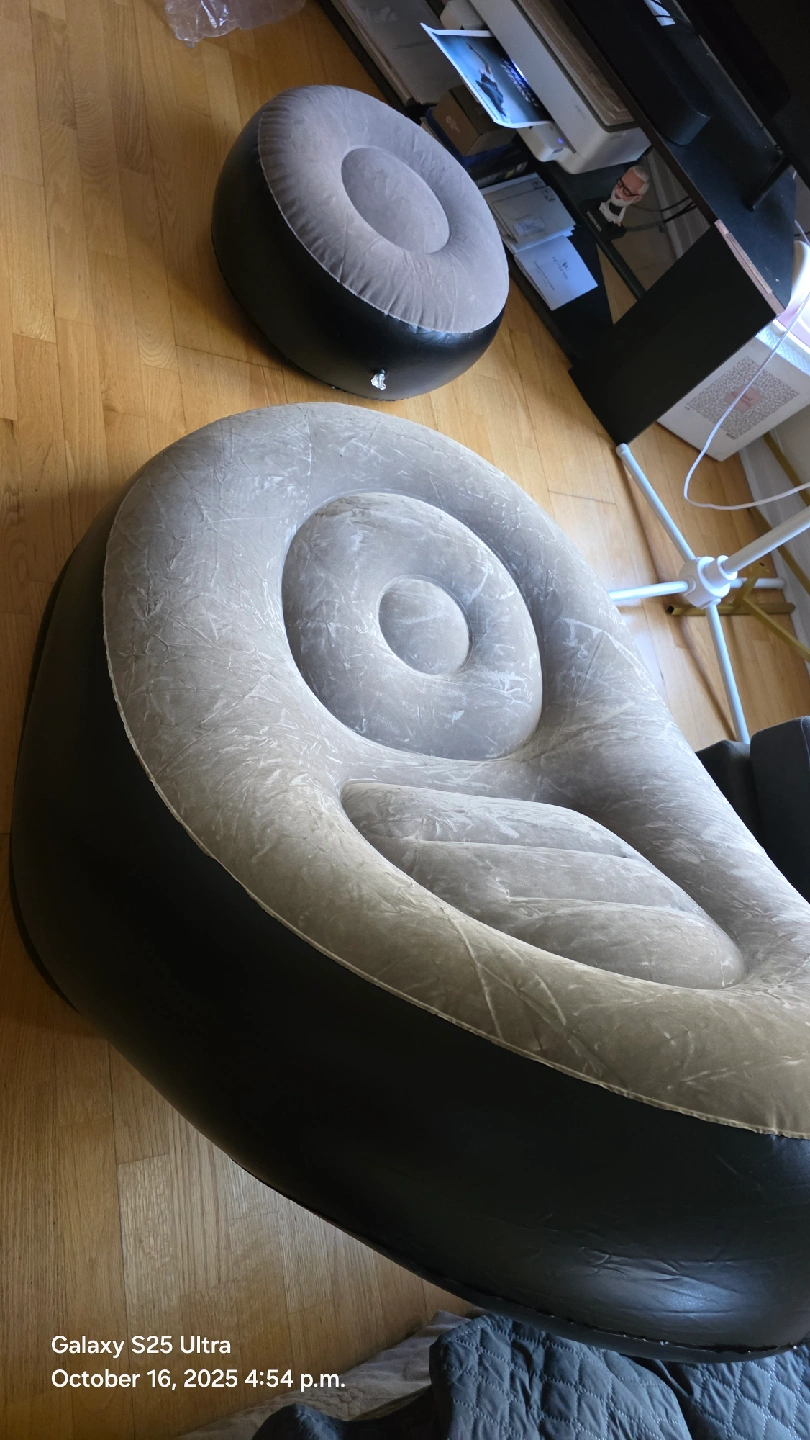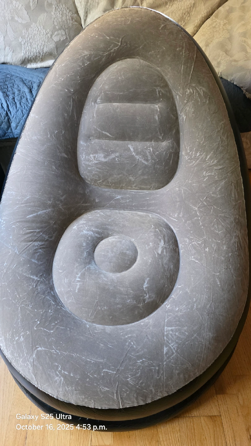 161Selling an inflatable sofa chair with a footstool. It's suitable for both indoor and outdoor use and made with flocking material. Retails for $67.50 open box product. brand new.