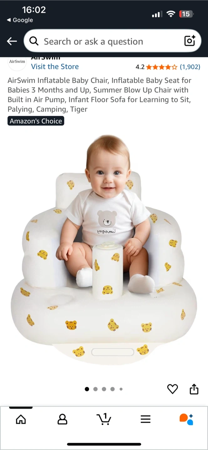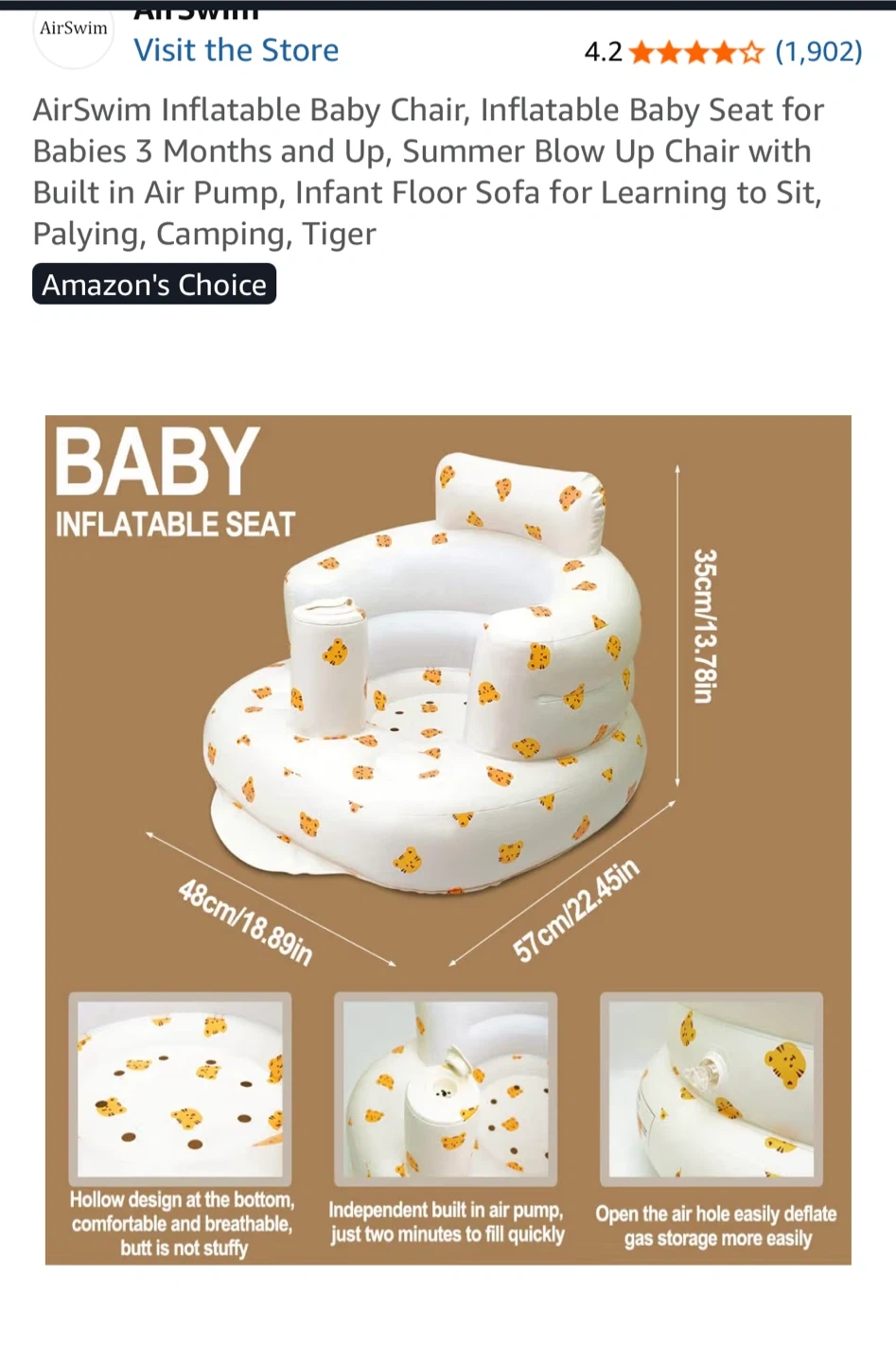 Selling an AirSwim inflatable baby chair with a cute tiger design! It's perfect for babies 3 months and up who are learning to sit. It has a built-in air pump for easy inflation and deflation, and it's great for use at home or while camping! The dimensions are approximately 48cm x 57cm x 35cm.