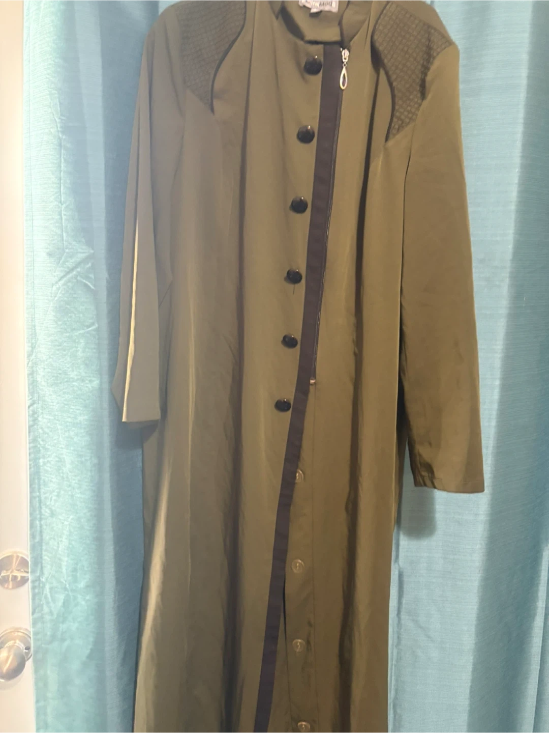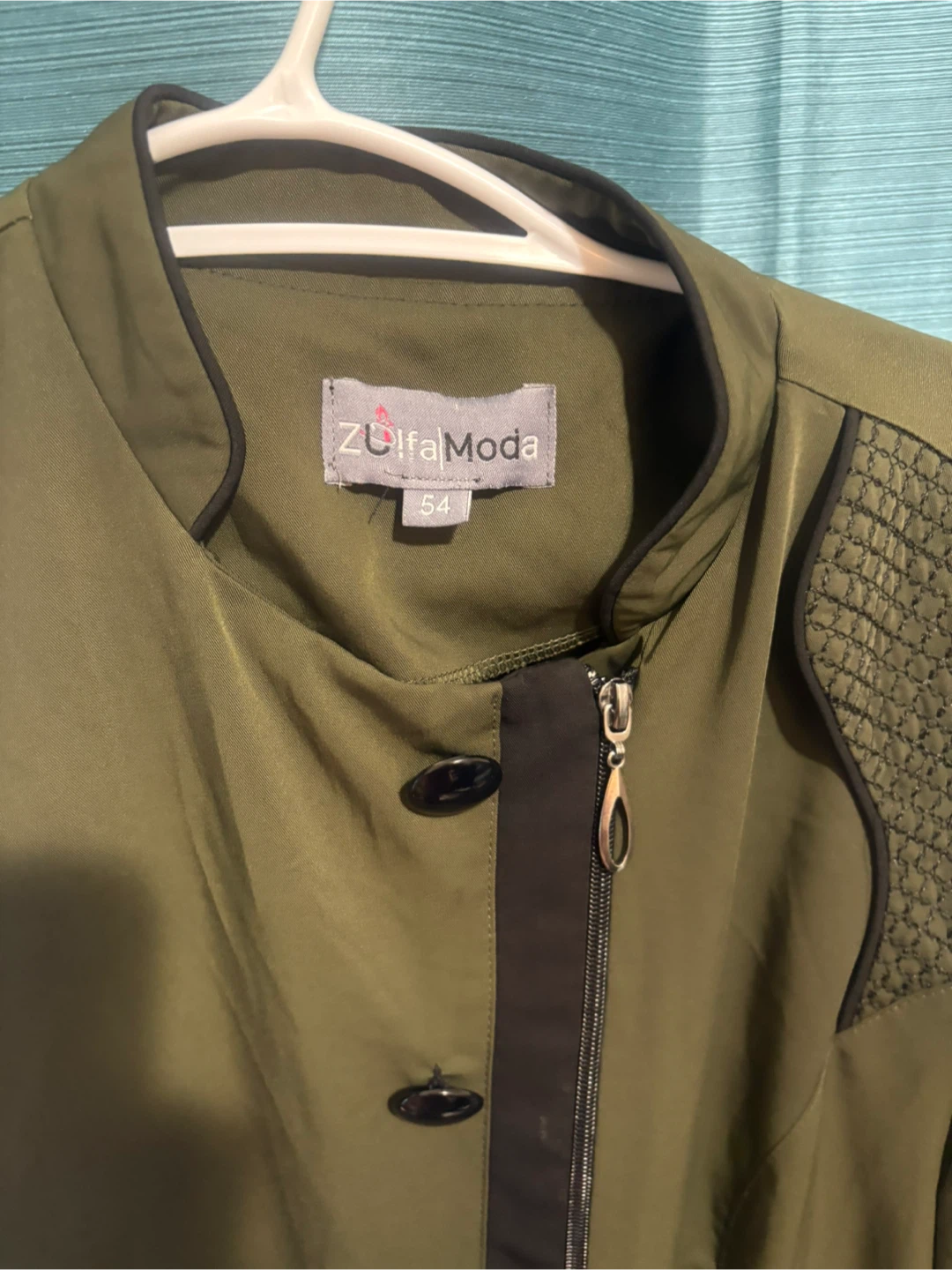 Selling a Zulfa Moda coat in olive green! It's a size 54 and features a unique asymmetrical zipper detail. Perfect for adding a touch of sophistication to your wardrobe( 25$ price firm )no bargain pls