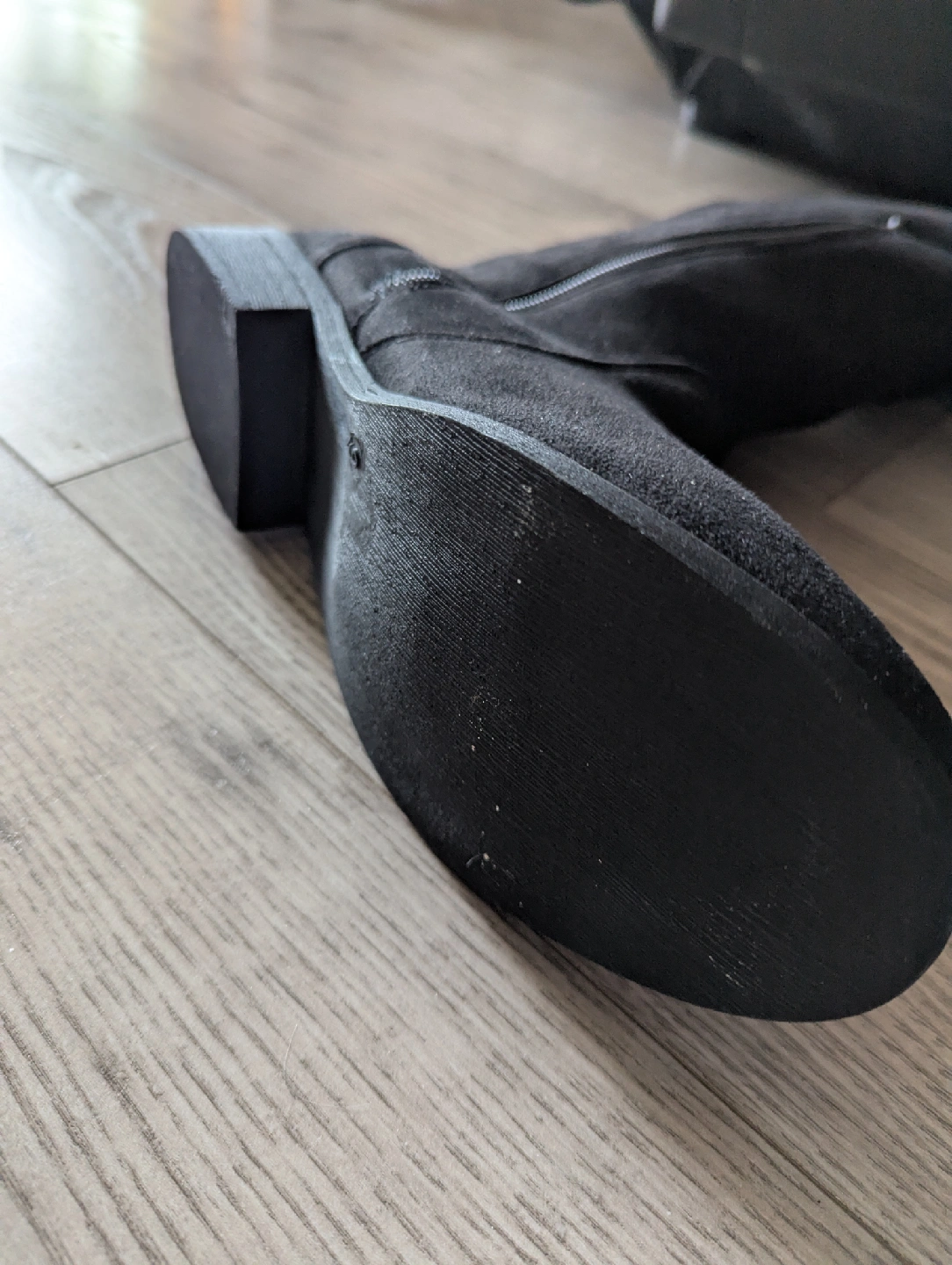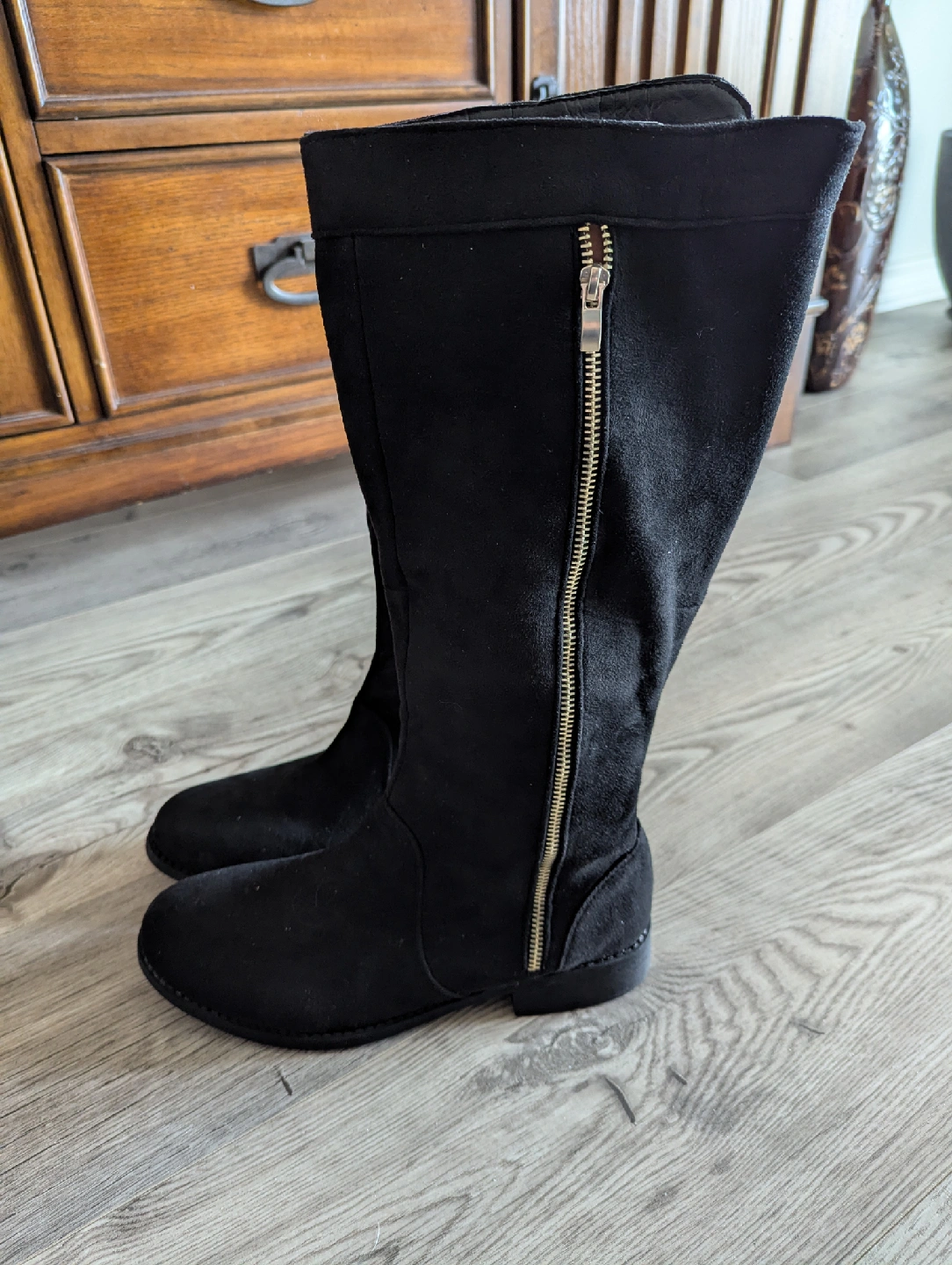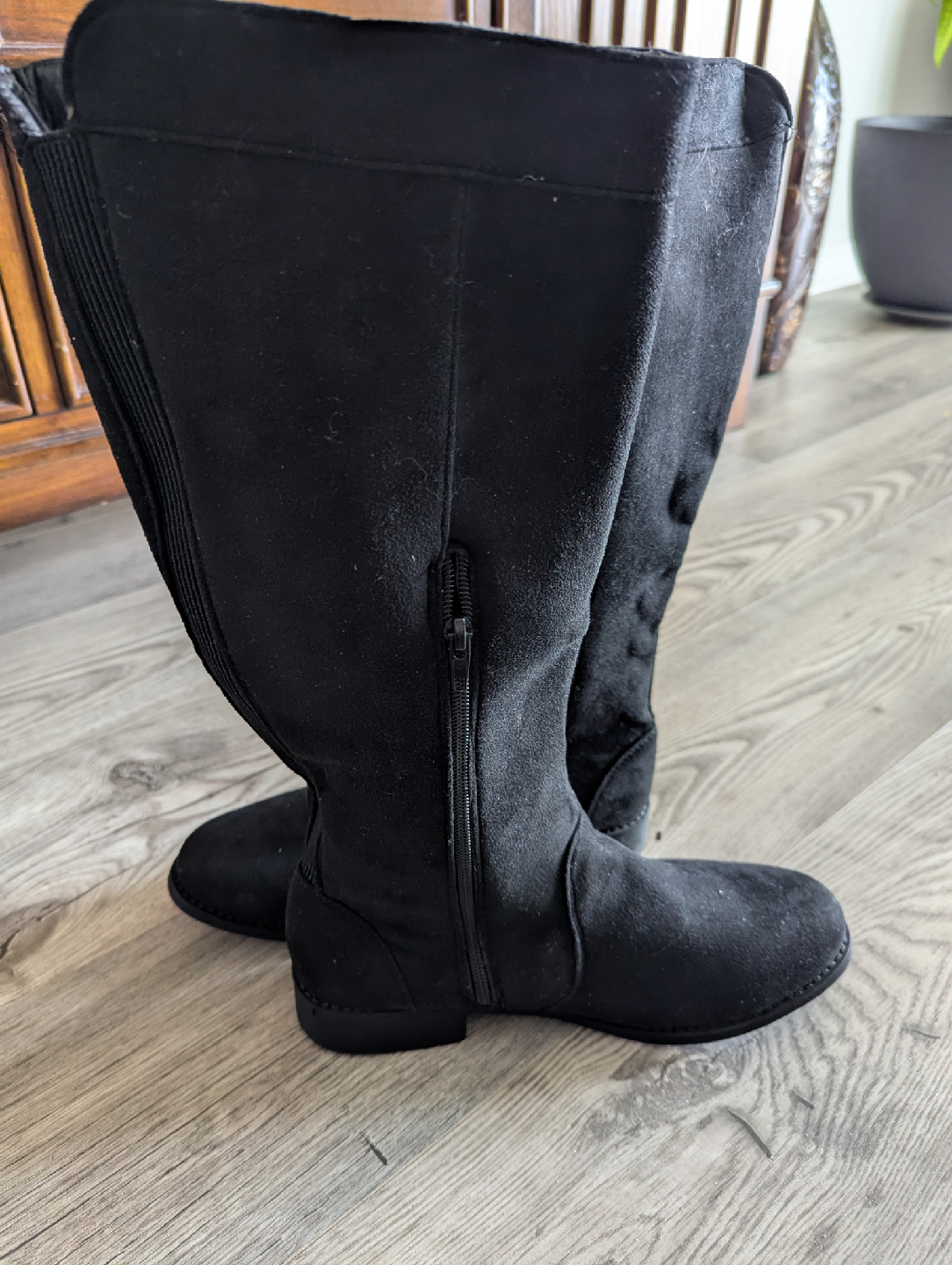 Selling a pair of black knee-high boots. They are made of suede and have a zipper detail. Perfect for fall!