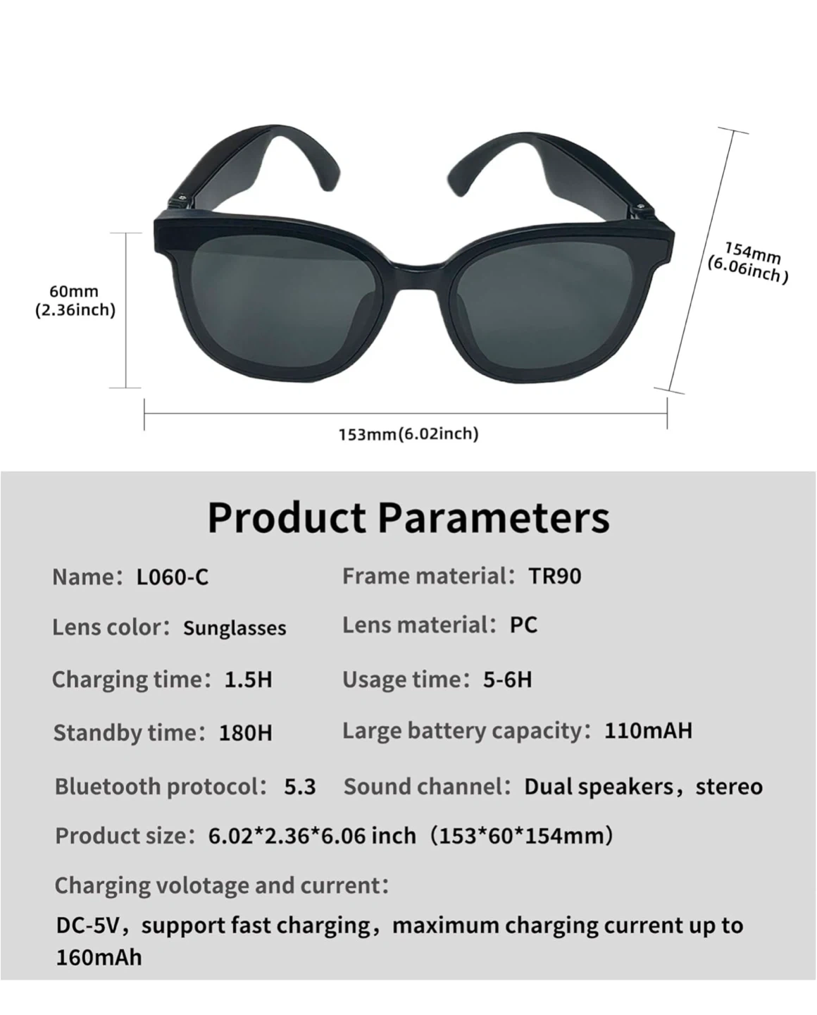 These audio sunglasses feature Bluetooth 5.3 for a stable connection and high-definition sound quality. They have lightweight lenses with UV protection, made from PC material for high impact strength. The HD lenses filter out harmful blue light and reduce visual fatigue. Enjoy long-lasting battery life with 6 hours of continuous call time and 180 hours of standby time. They also have multiple features like wireless music, answering phone calls, stereo sound, and HD eye protection
