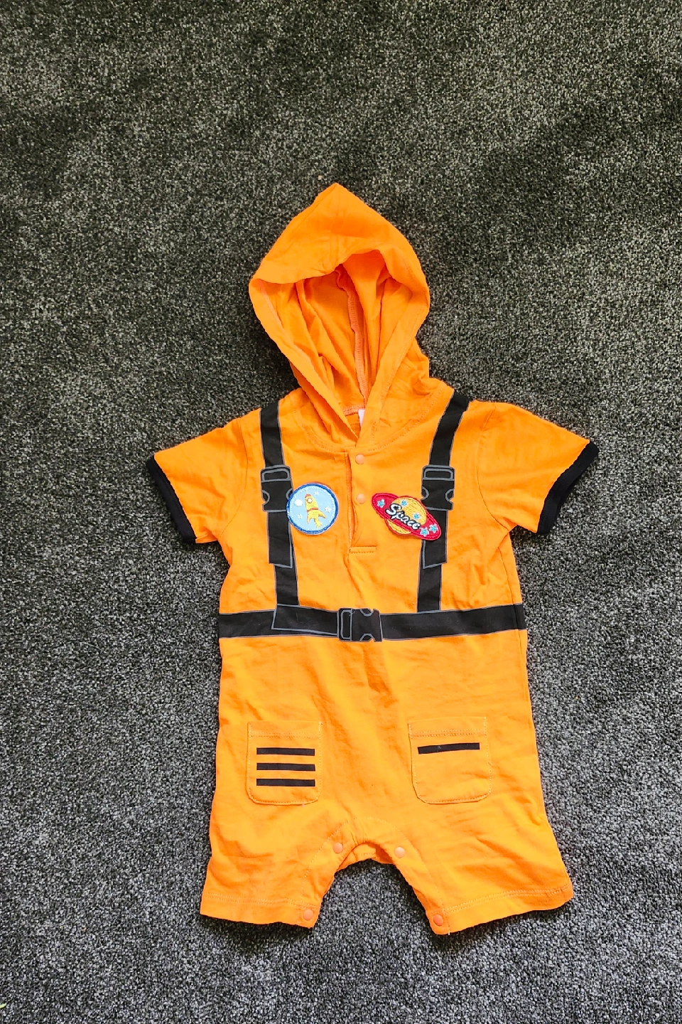 Selling a super cute orange astronaut costume for babies! It's in great condition and perfect for Halloween or dress-up. The size is 9-12 months, so it's ideal for little ones who are starting to explore the world.