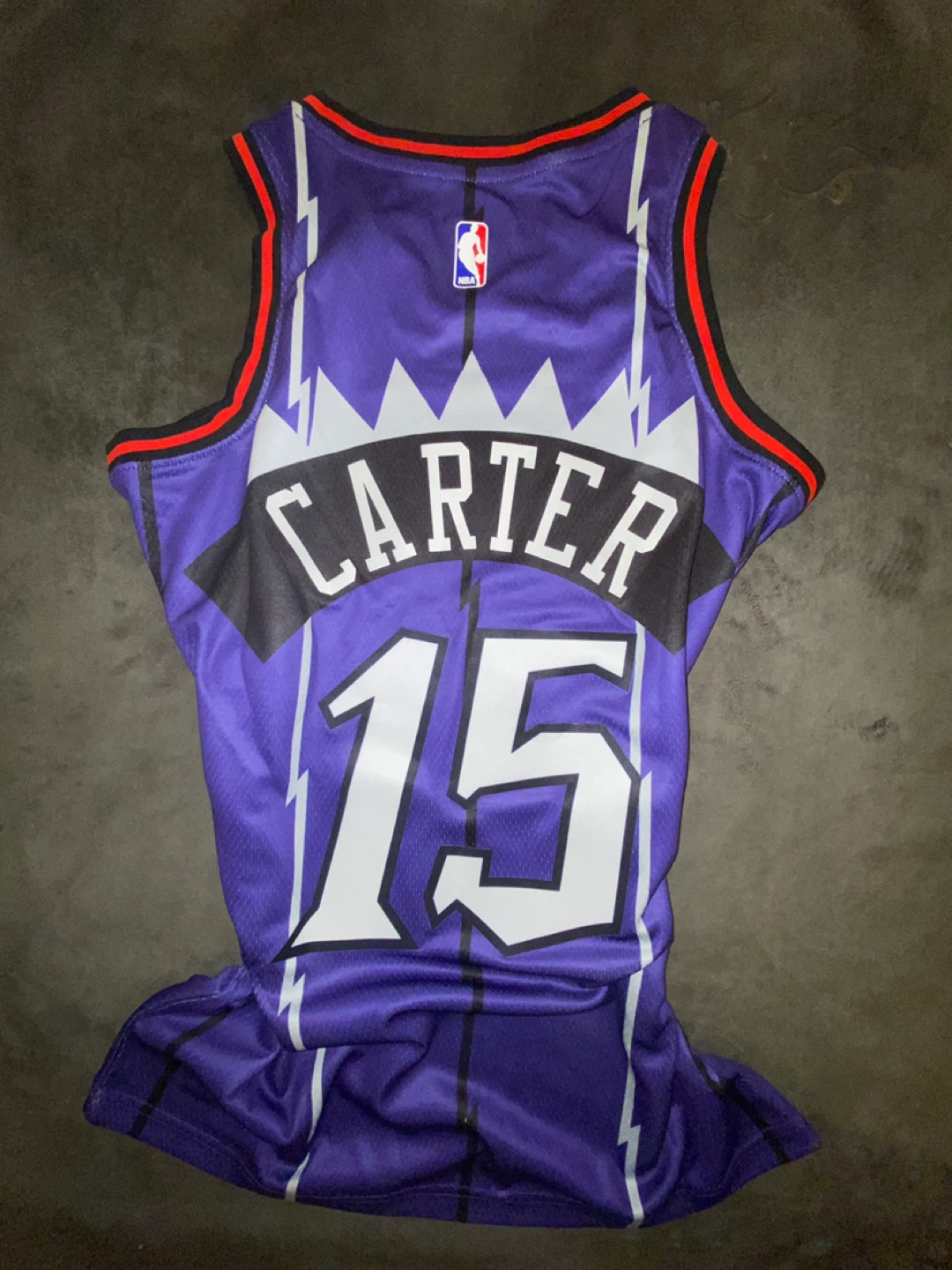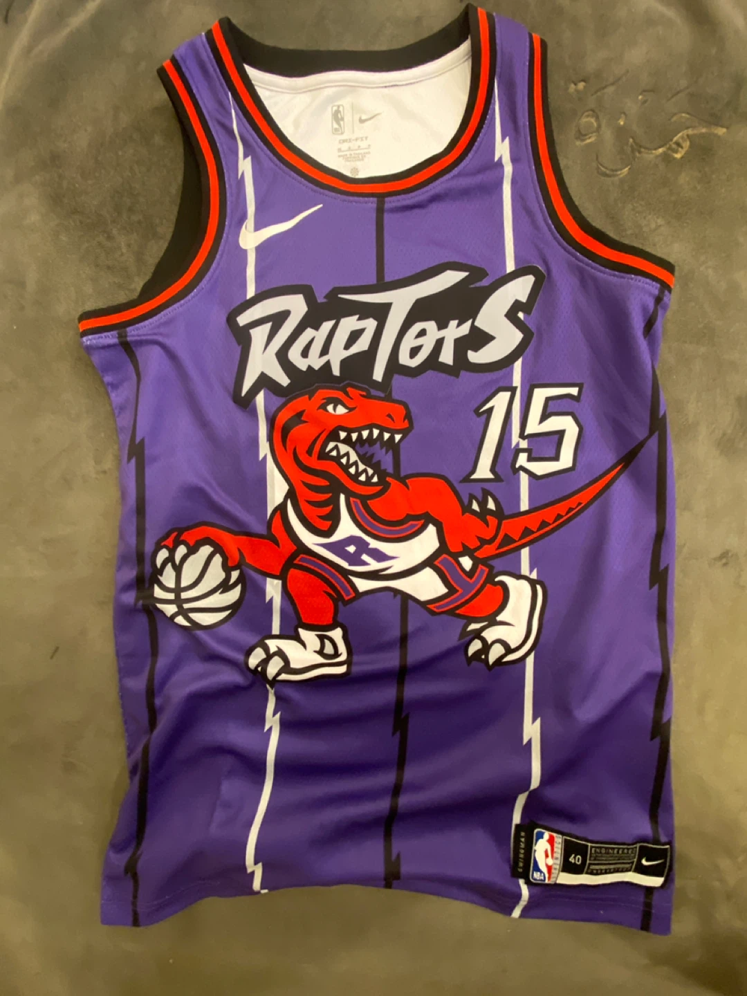 Selling a Nike Toronto Raptors Vince Carter #15 jersey in size 40. The jersey is purple with white and red accents. It features the classic Raptors logo and Carter's name and number. It's in great condition and ready for a new home!