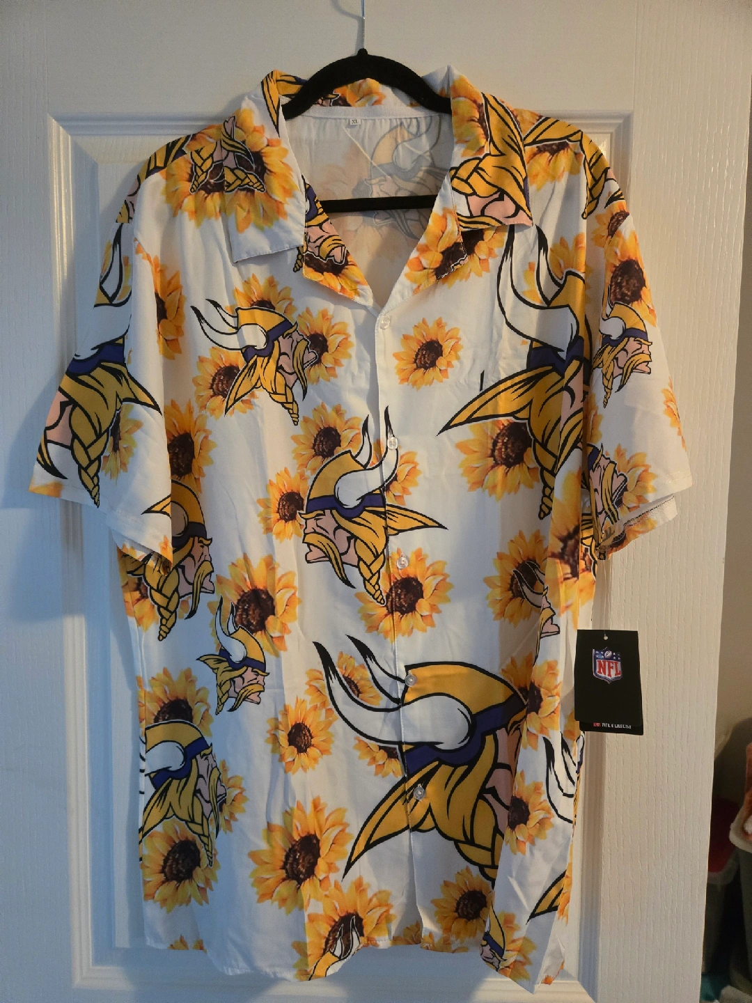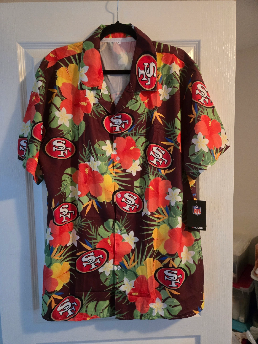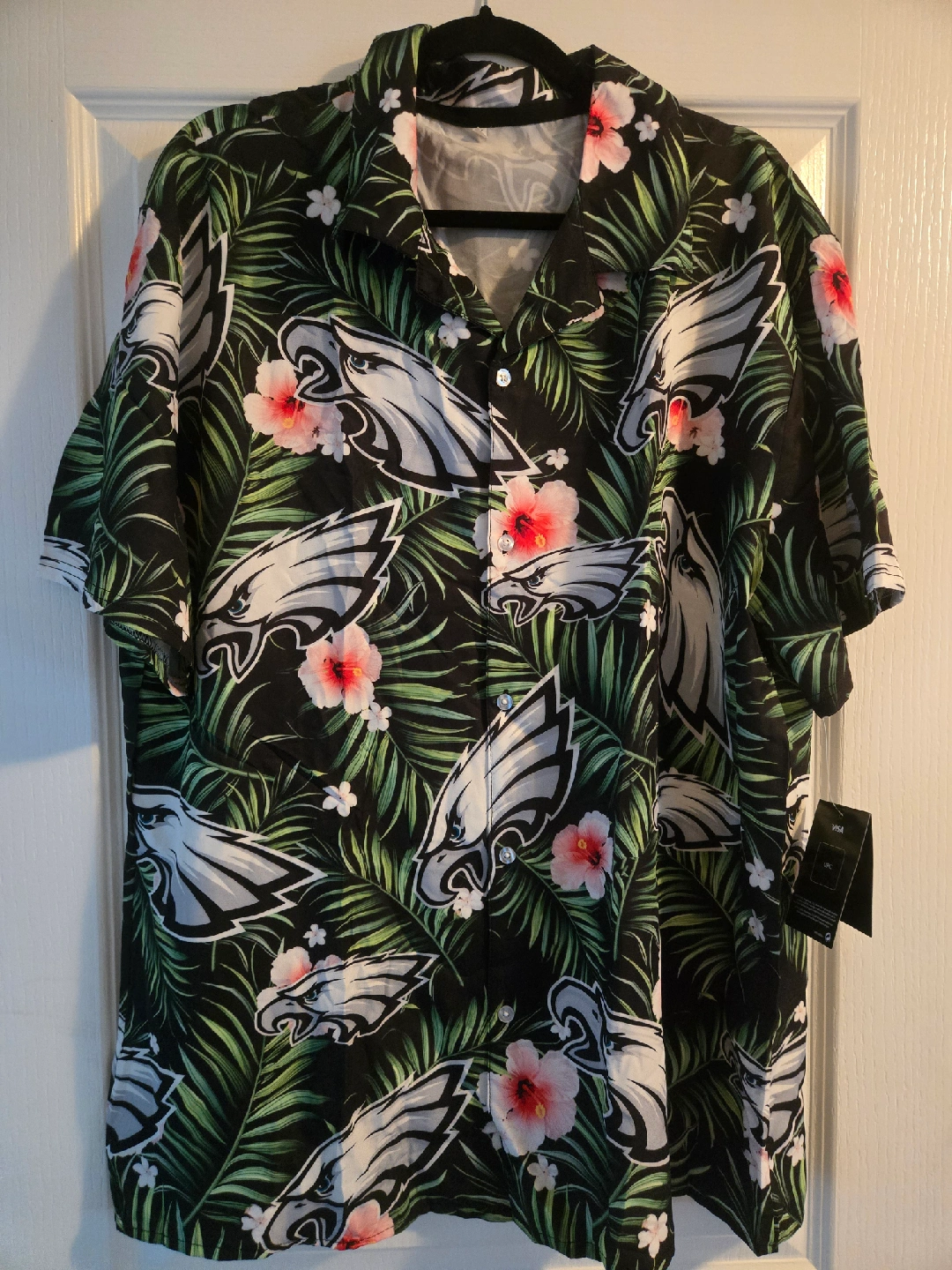 Selling a collection of NFL Hawaiian shirts! Each shirt features a different team: the Philadelphia Eagles, San Francisco 49ers, Miami Dolphins, Minnesota Vikings, and Kansas City Chiefs. Perfect for showing off your team spirit in a fun, tropical style. $60 each
