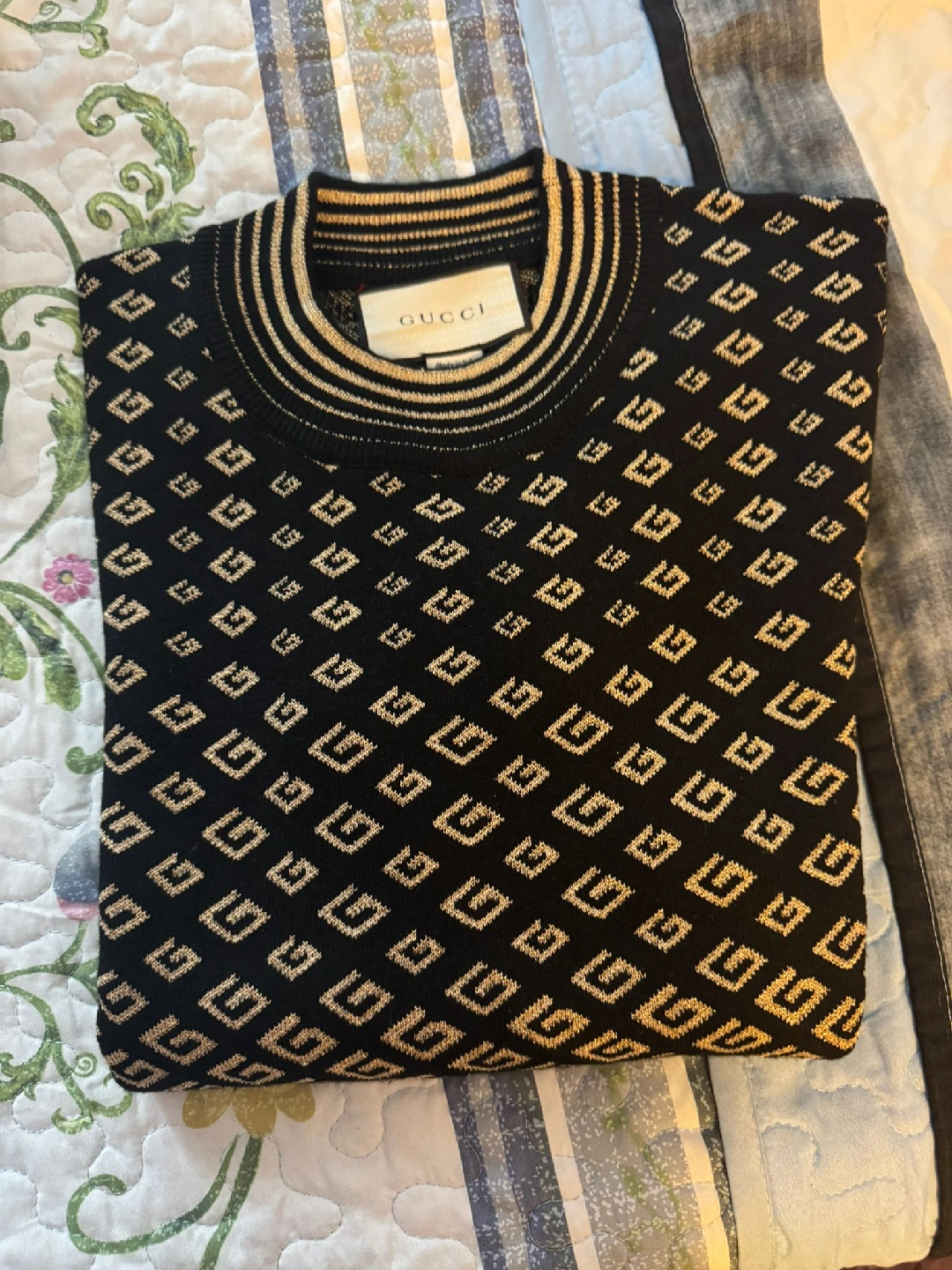 Selling a stylish Gucci knit sweater featuring a black and gold pattern. It's in great condition and ready for a new home! Perfect for adding a touch of luxury to your wardrobe