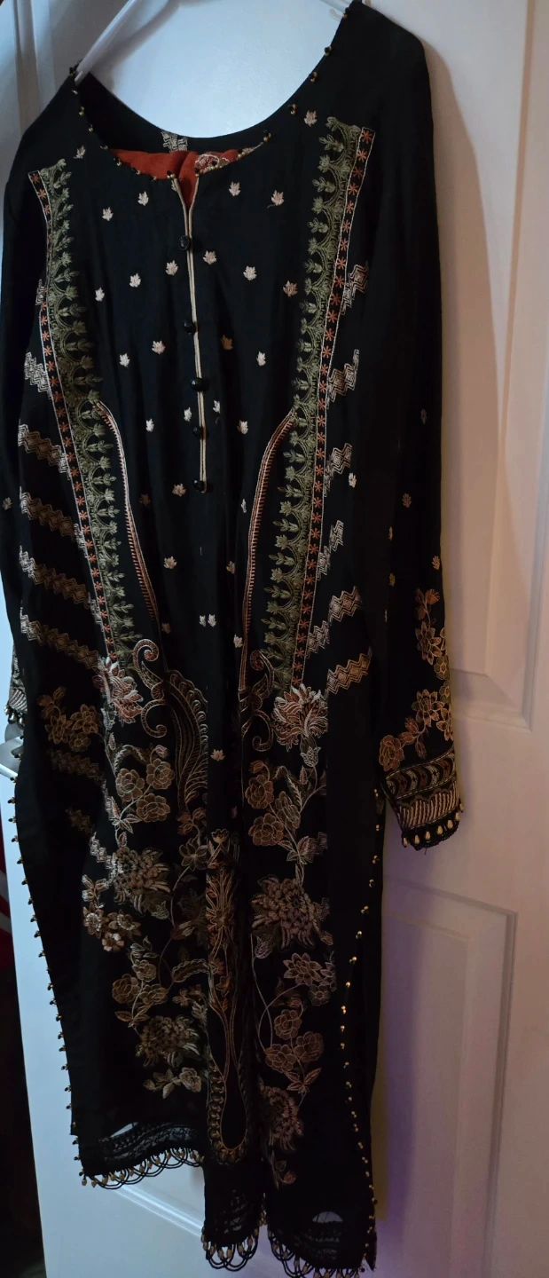Selling a beautiful salwar kameez suit set. The set includes a black embroidered top, a rust-coloured shawl, and black pants. Perfect for special occasions or cultural events!