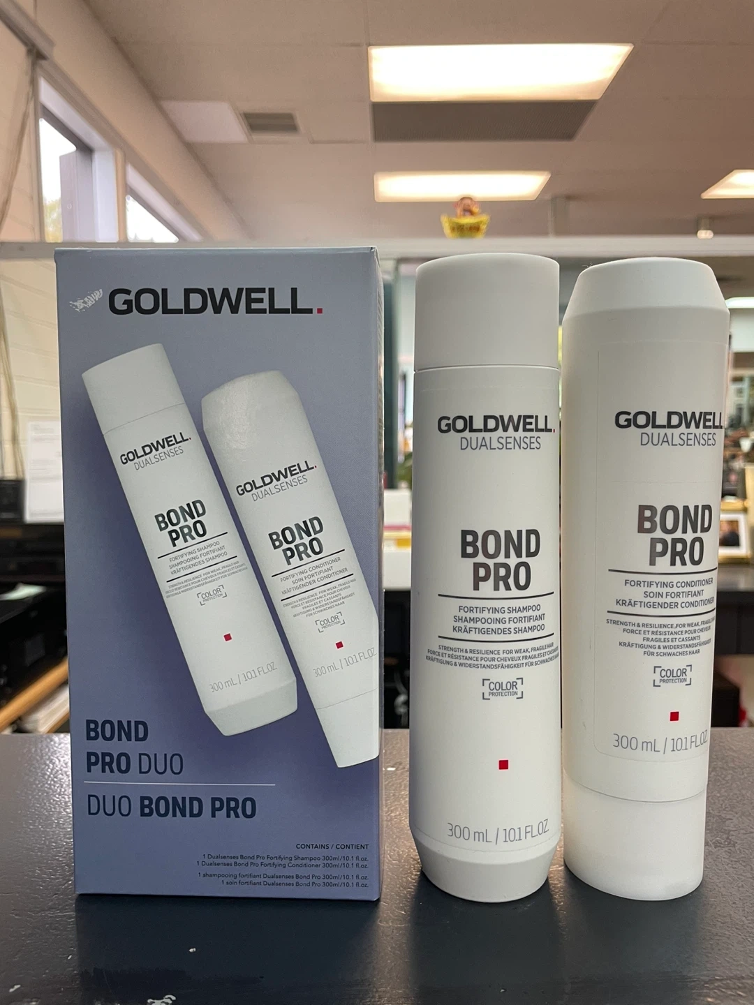 Goldwell Bond Pro set. It includes: - Bond Pro Fortifying Shampoo 300ml - Bond Pro Fortifying Conditioner 300ml Perfect for strengthening weak, fragile hair and providing colour protection *pick up in Kerrisdale, Vancouver Tue — Sat. 10am - 5pm Cash only
