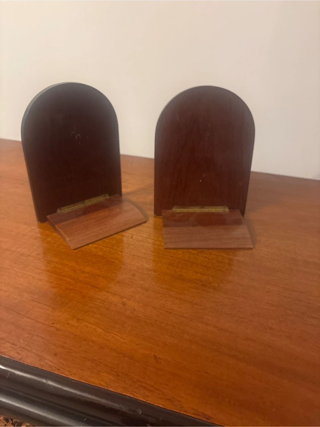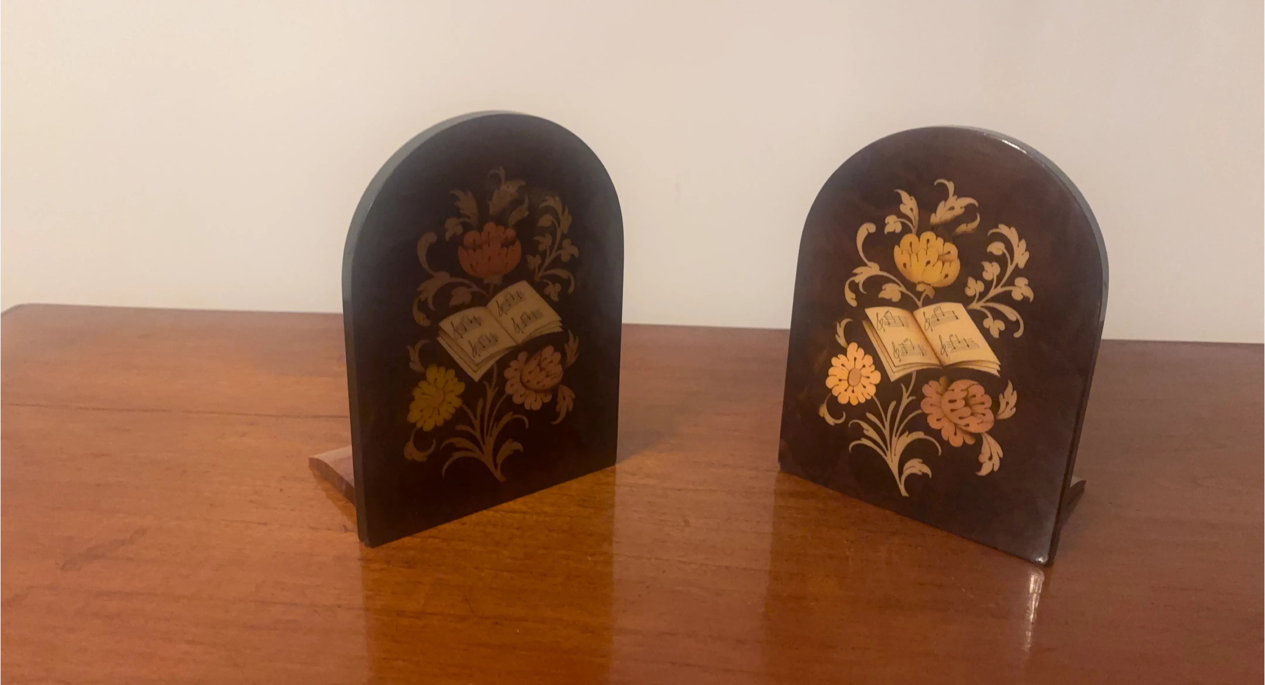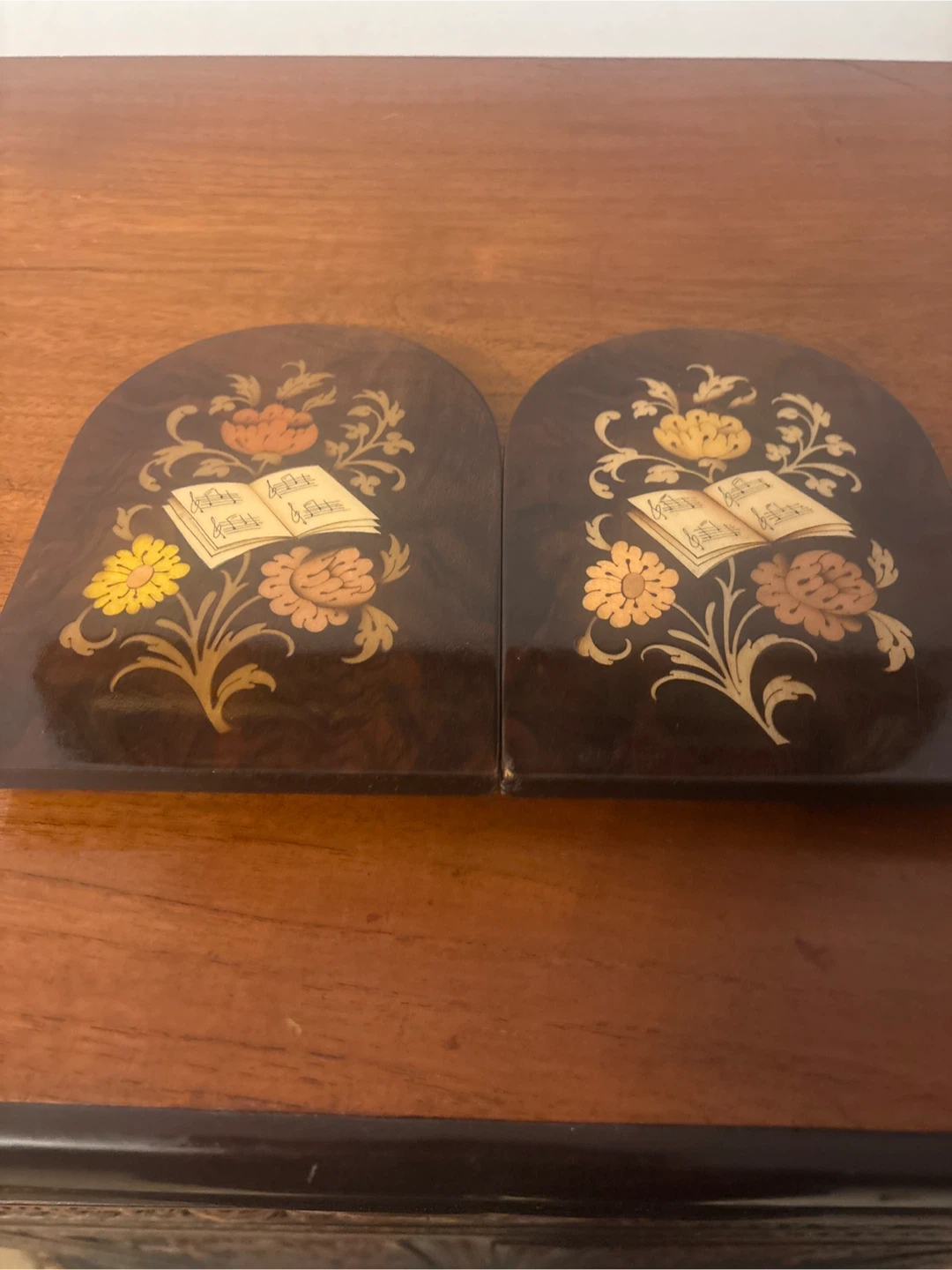 Selling a pair of vintage bookends. They feature a dark wood finish with inlaid floral and music book designs. Perfect for adding a touch of classic charm to your bookshelf!