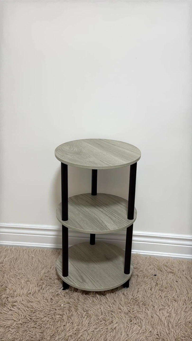 Selling a cute 3-tier round side table! It's a stylish and functional piece, perfect for adding a bit of storage and display space to any room. The table features a grey wood finish with black legs, giving it a modern look that fits well with various decor styles