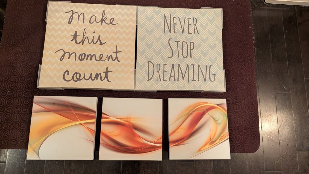 Selling a set of five decorative wall art canvases. Two of the canvases have text: "Make this moment count" and "Never stop dreaming". The other three feature abstract designs with orange and white colours. These would be great for adding a touch of style to any room