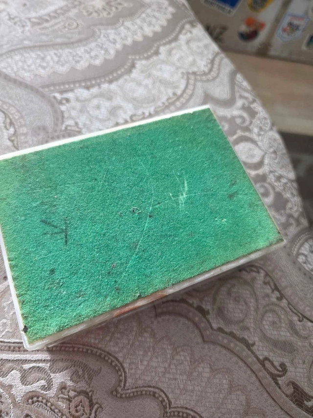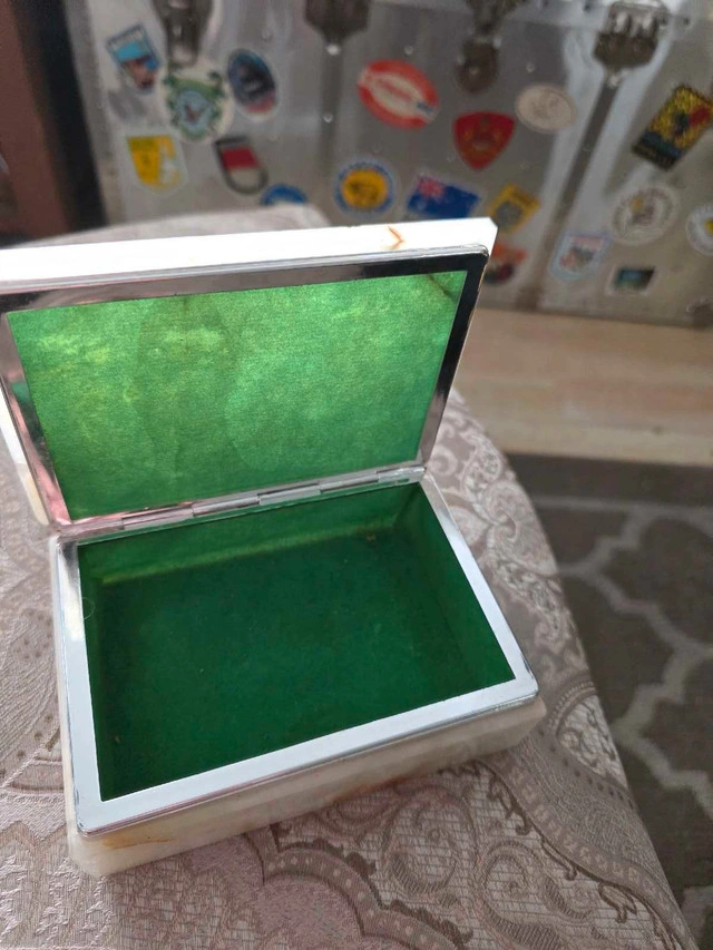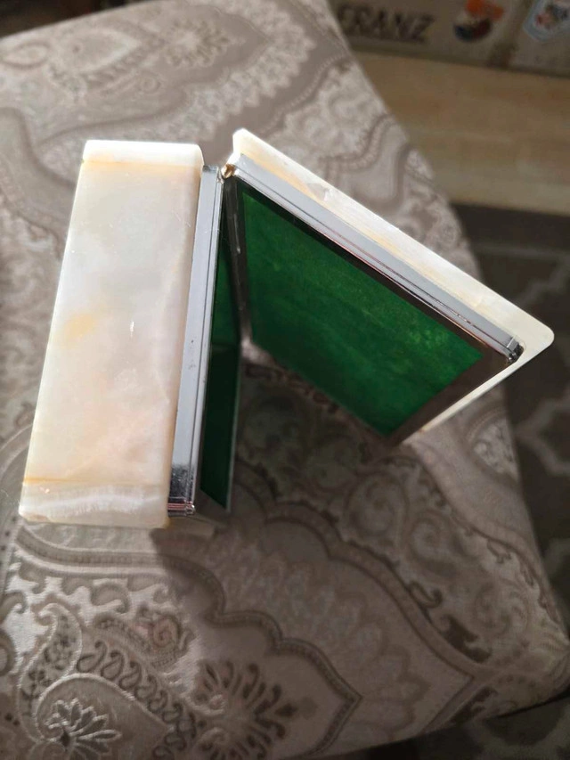 Adorn your space with this elegant, used onyx box featuring a soft, green felt interior and metal trim, perfect for stashing jewellery or precious keepsakes. The box has some wear, which is reflected in the price, but is overall a beautiful piece. There are some imperfections congruent with its age. High quality hinged. Imagine this little treasure chest sitting pretty on your dresser, holding all your secrets and sparkling jewels! It's just waiting to be adopted into a loving home. Psst! If the ad's still up, it's still available!