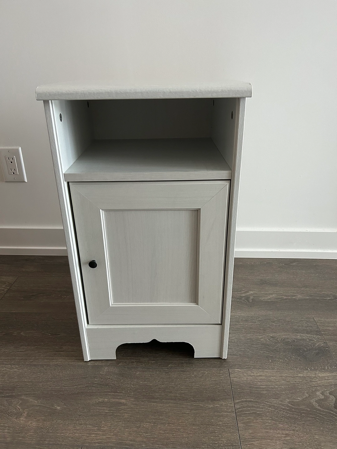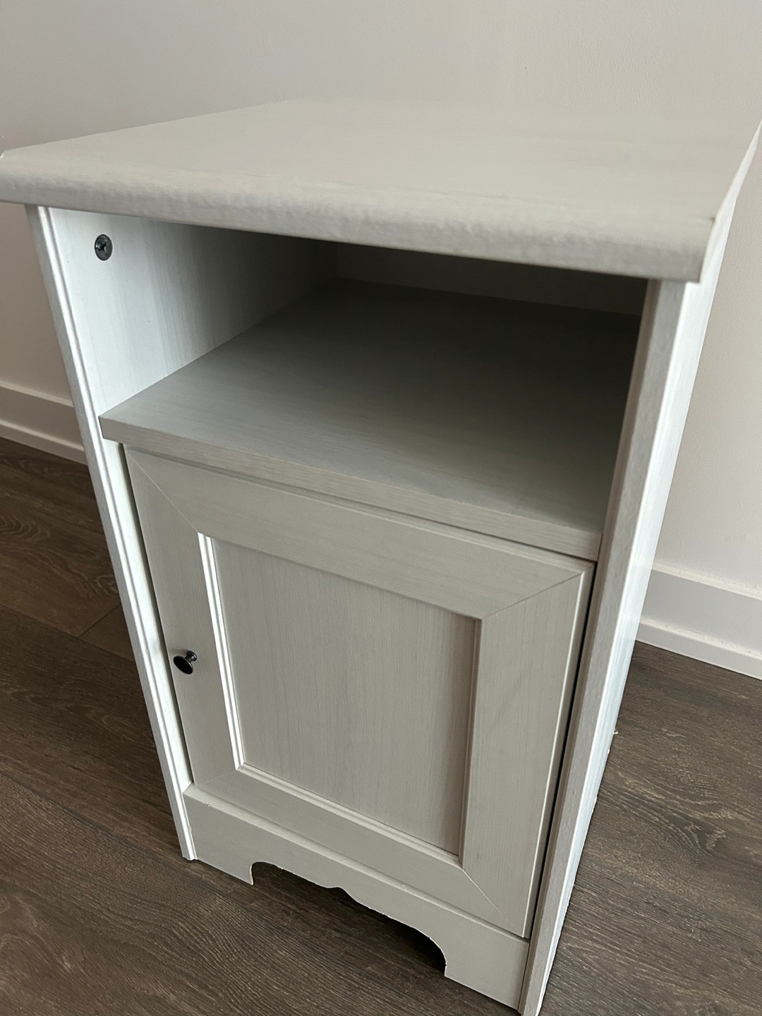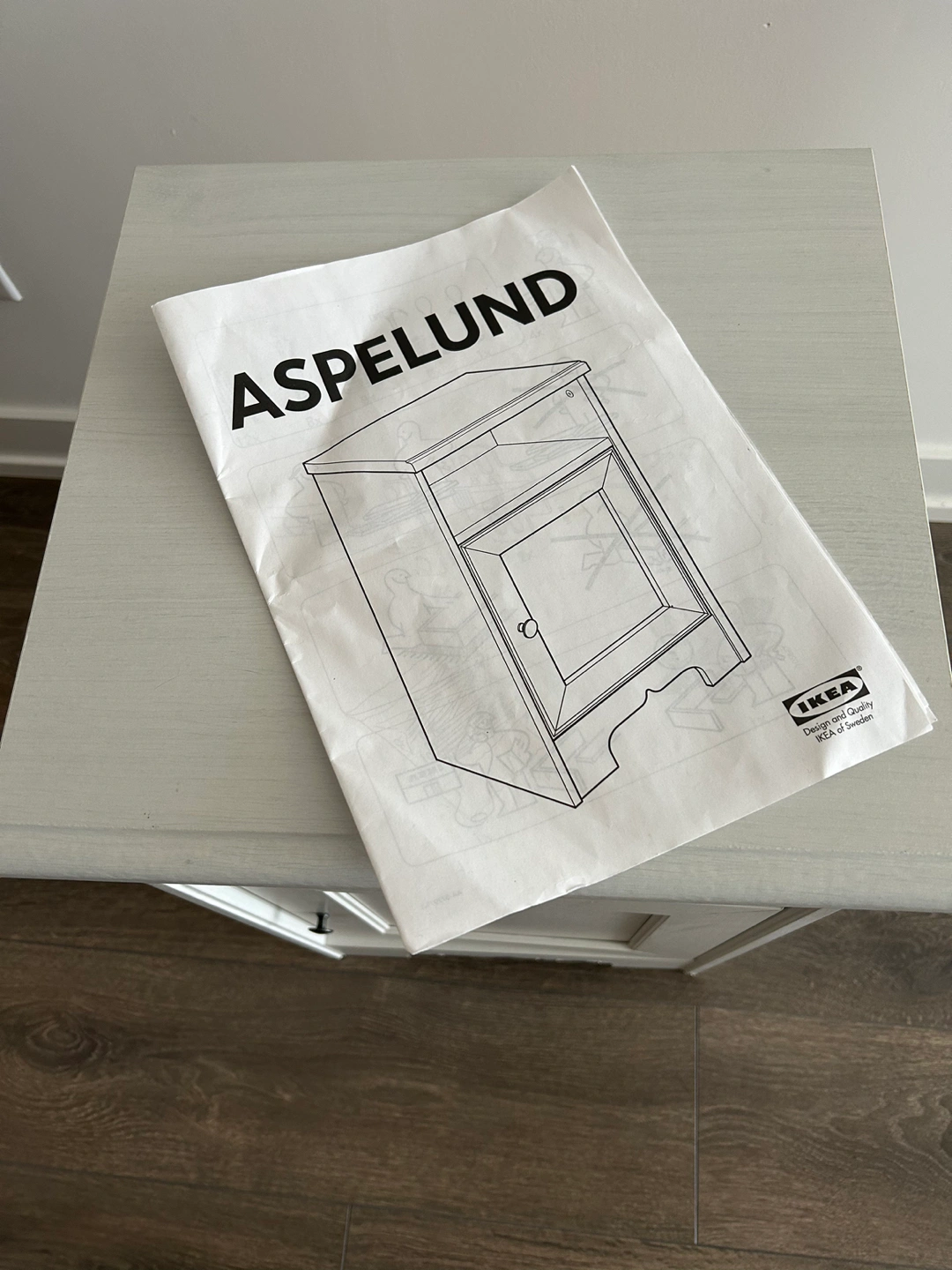 Aspelund bedside table with delicate feminine detailing at the bottom. Brand new, with one very small scratch. Comes with assembly manual, just in case. Door can be hung on the right or the left.