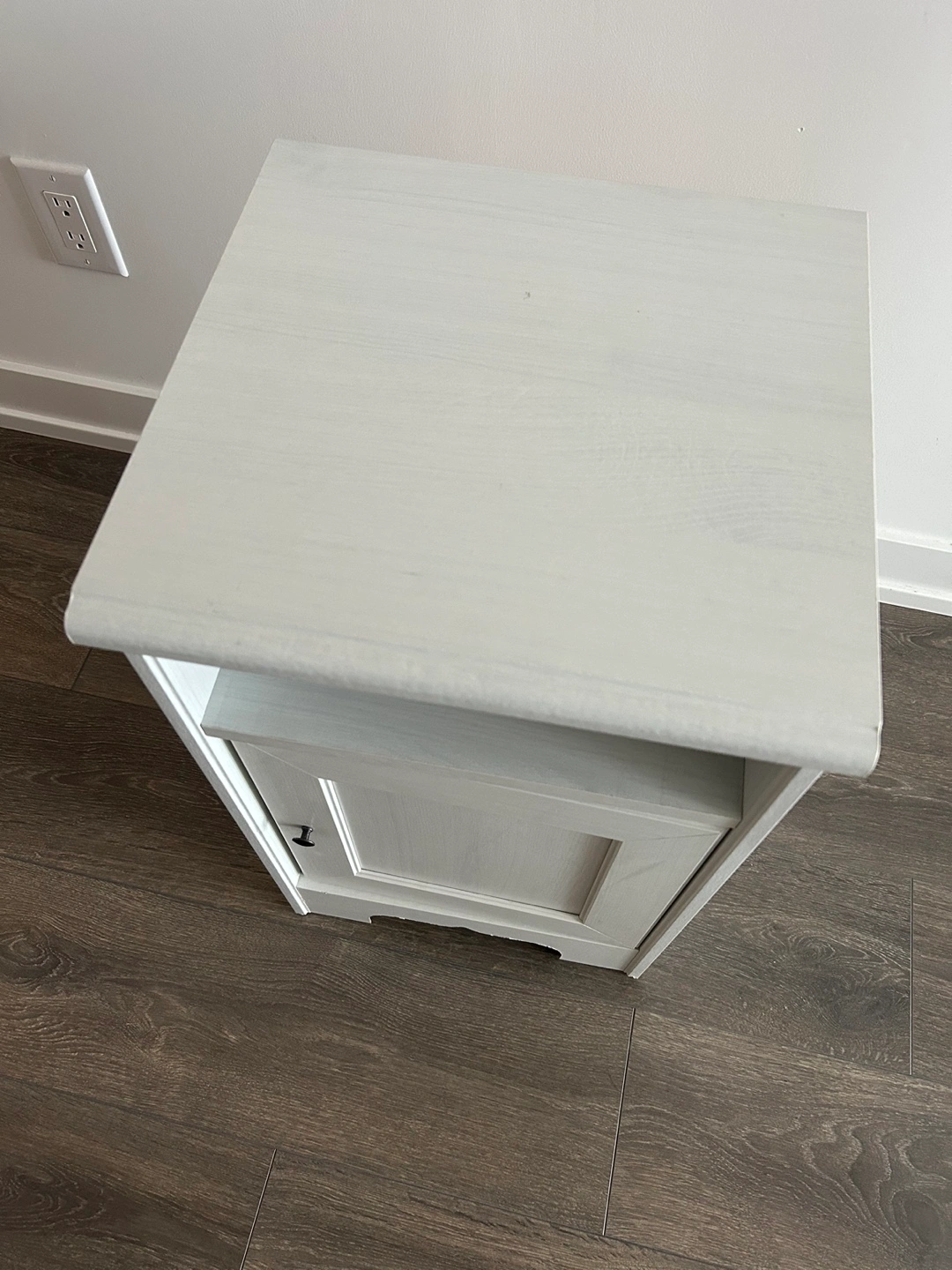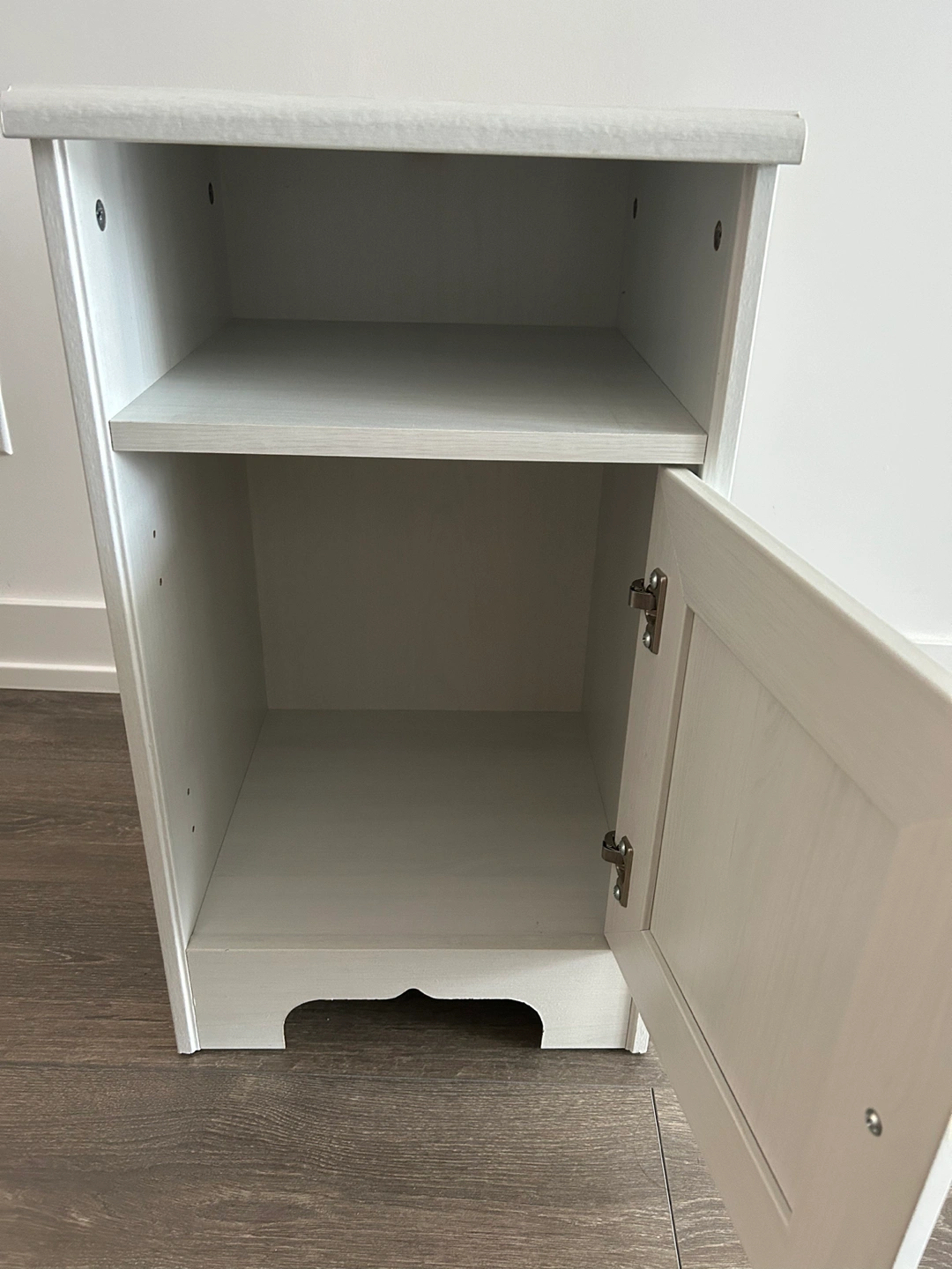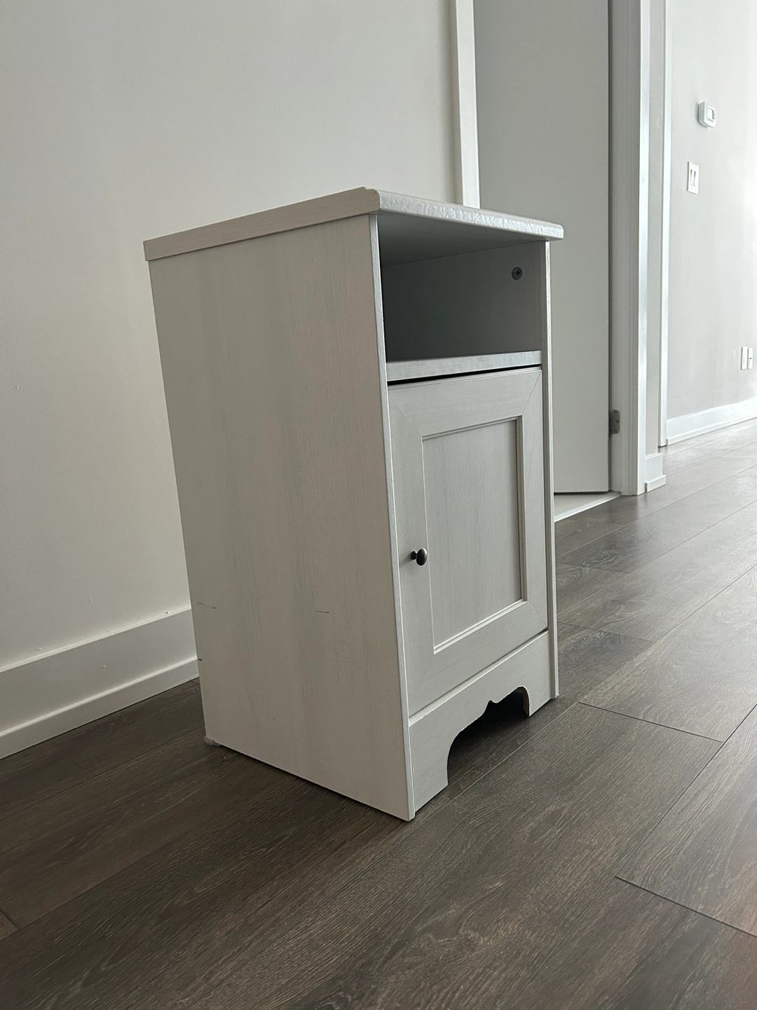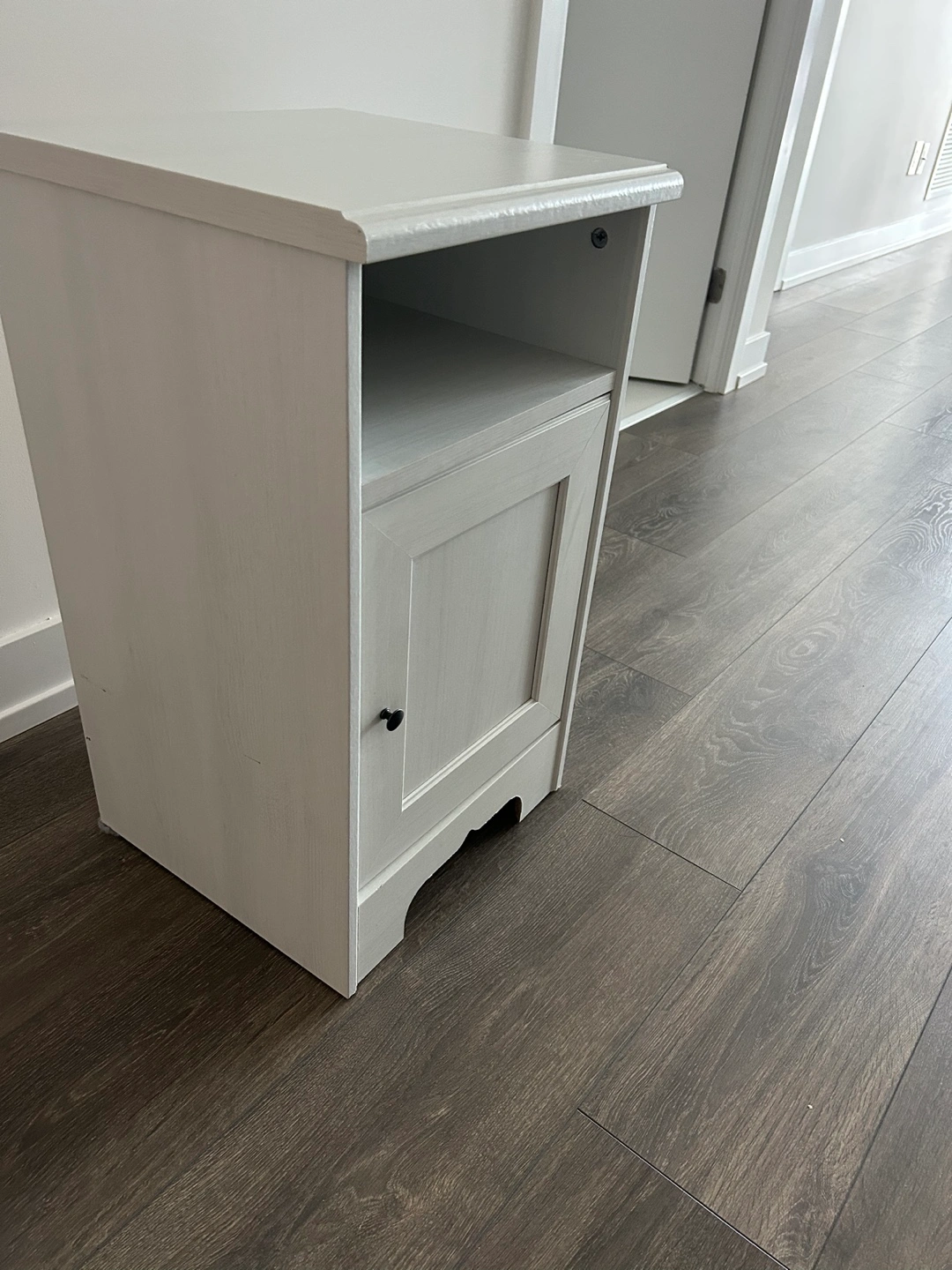 Aspelund bedside table with delicate feminine detailing at the bottom. Brand new, with one very small scratch. Comes with assembly manual, just in case. Door can be hung on the right or the left.