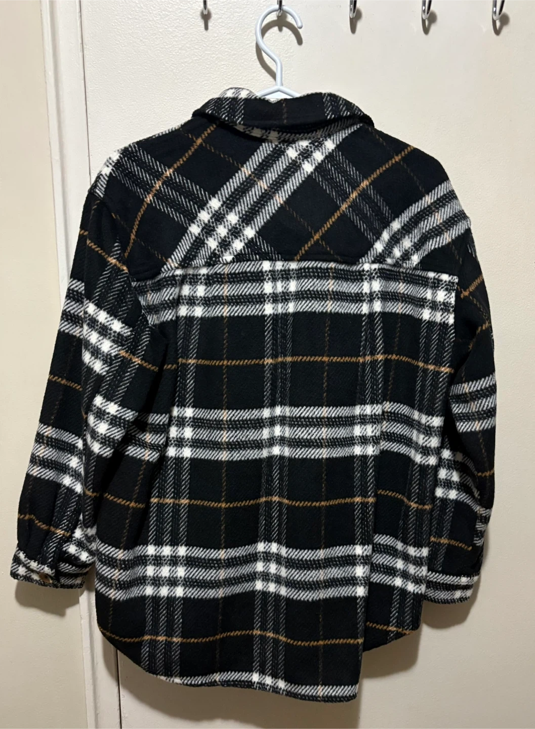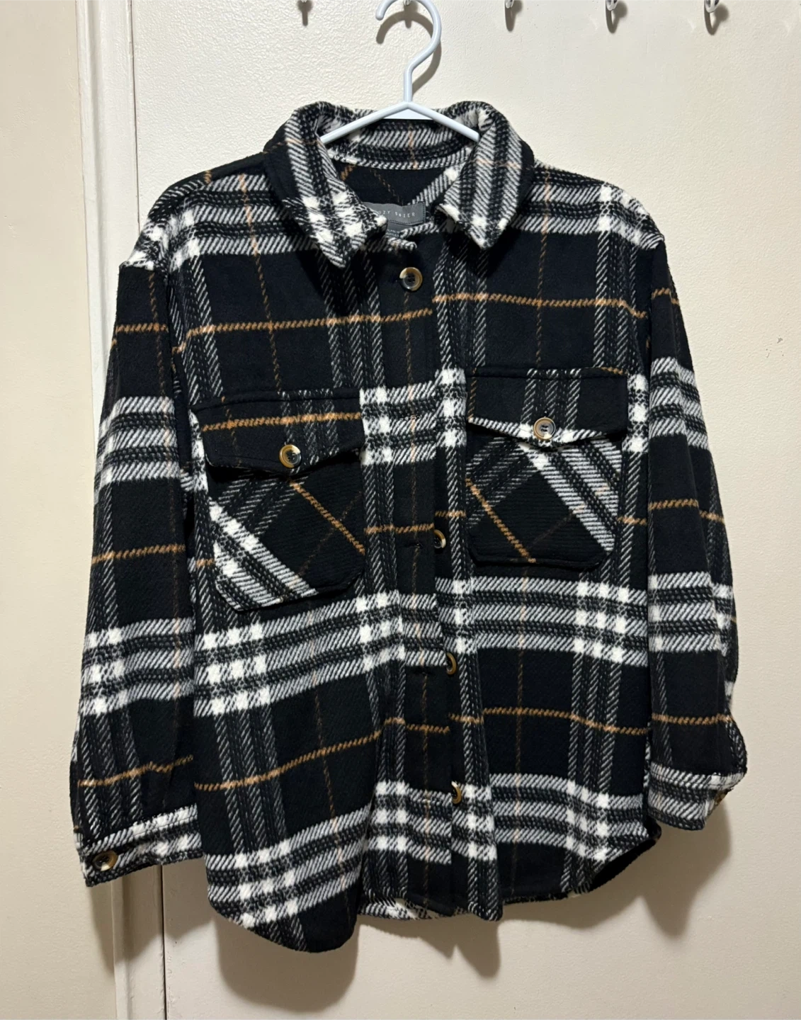 Cozy Suzy Shier flannel Shacket in a classic plaid pattern, perfect for layering! It's a size medium and made of 50% polyester, 45% acrylic, and 5% other fibres