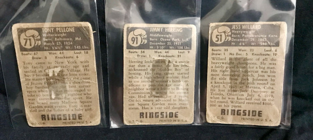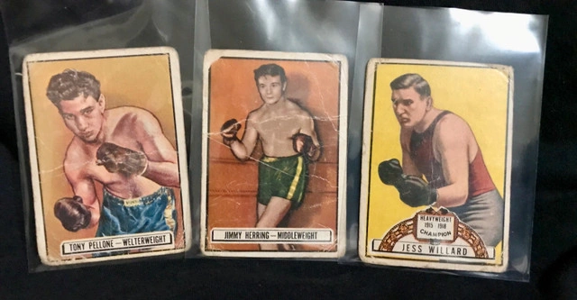 Selling three vintage Topps Ringside Boxing cards featuring #71 Tony Pellone Welterweight, #91 Jimmy Herring Middleweight, and Jess Willard Heavyweight Champion. These cards are from the 1950s and showcase classic boxing legends. As seen in the images, the cards are used, with visible wear which is consistent with age, adding to their authentic vintage charm. They would look great framed and displayed in your home. If the ad is up, the item is available!