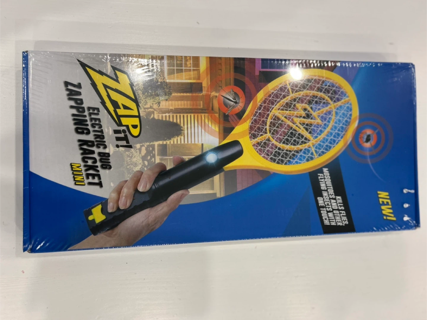 I'm selling a brand new Zap It! Electric Bug Zapping Racket Mini. It's designed with a triple-layer mesh for durability and features a LED light for zapping in the dark! It's rechargeable, offering up to 10,000 zaps on a single charge. Kills flies, mosquitoes and other flying insects on contact!