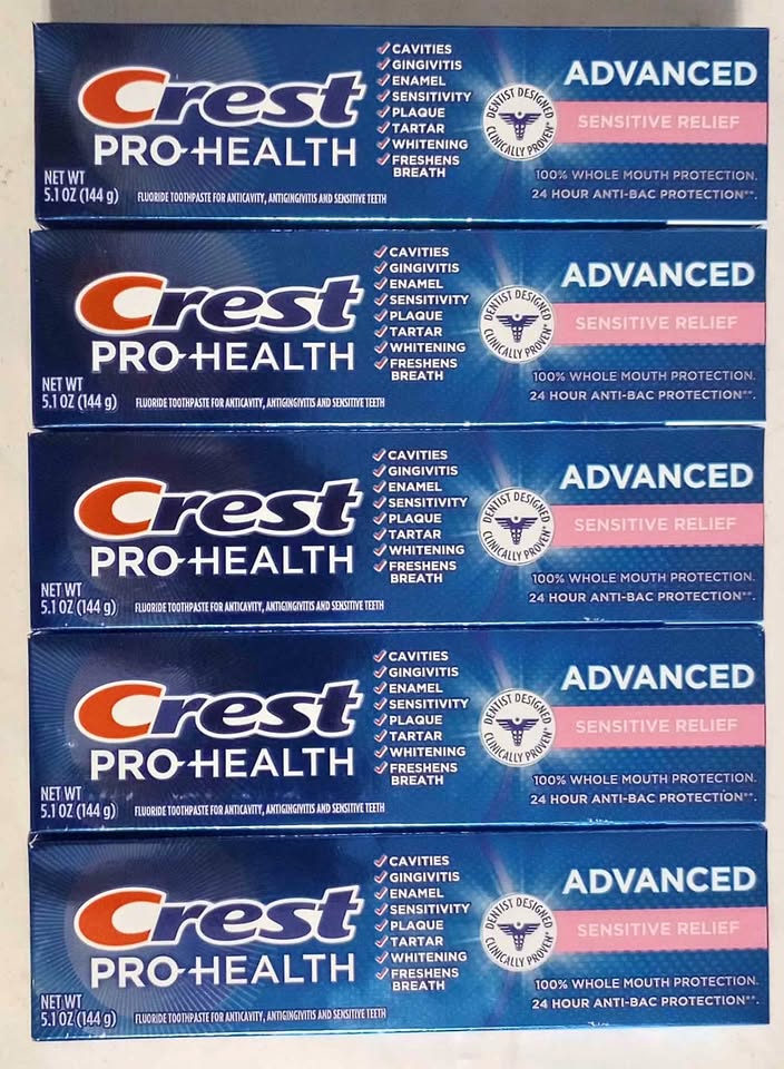 Selling sets of 5 Crest Pro Health Advanced Sensitive Relief Toothpaste. Sz. 5.1 oz (144 g). Qty: 5. Available for pickup in DUMBO Brooklyn Check out my other listings and build a large bundle!