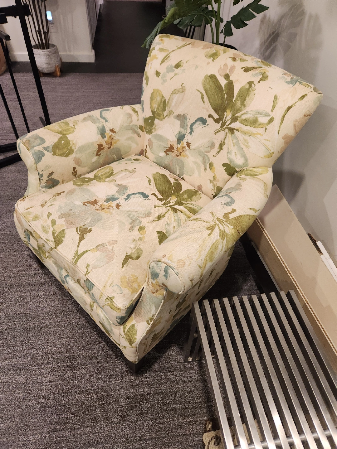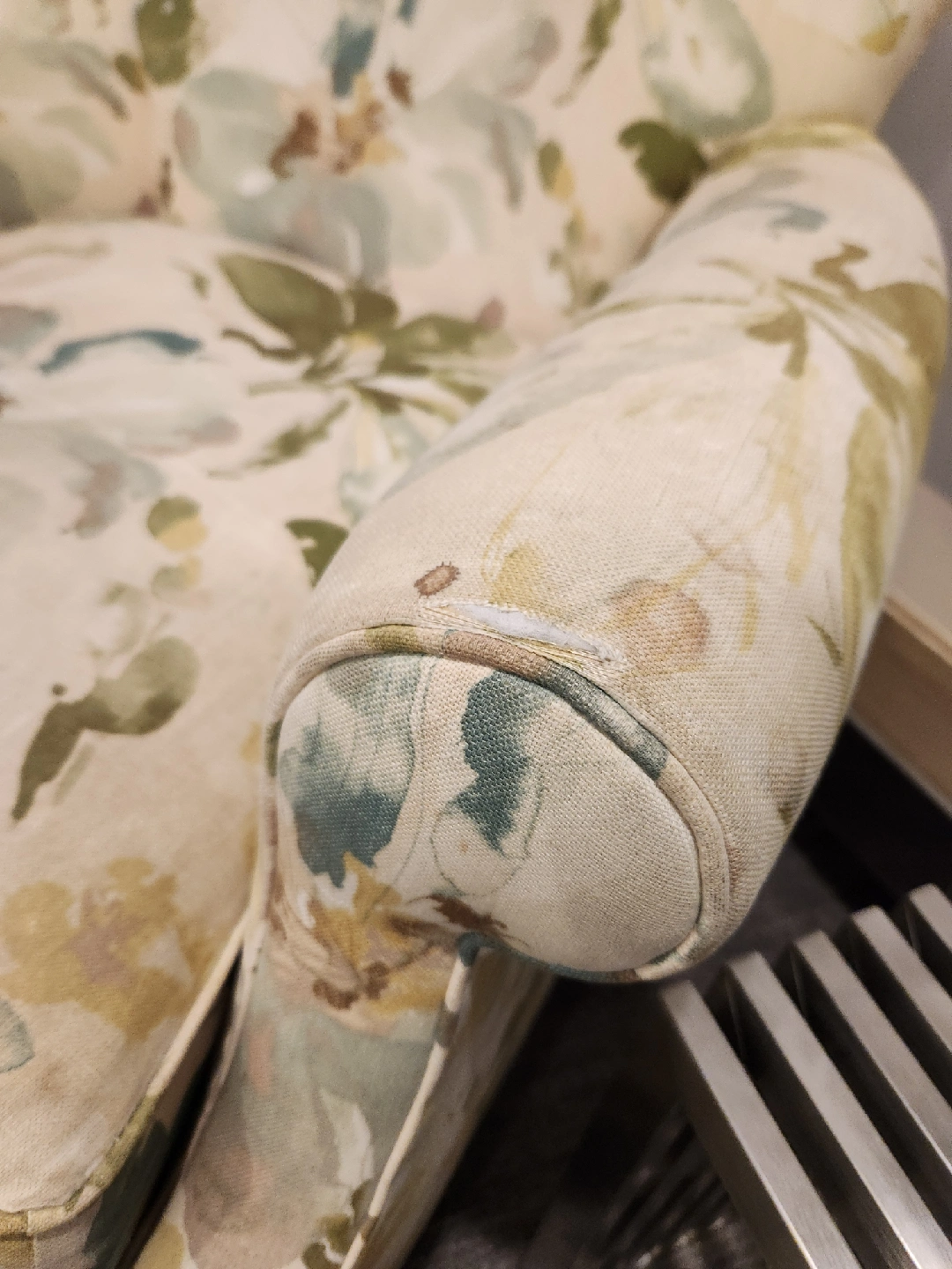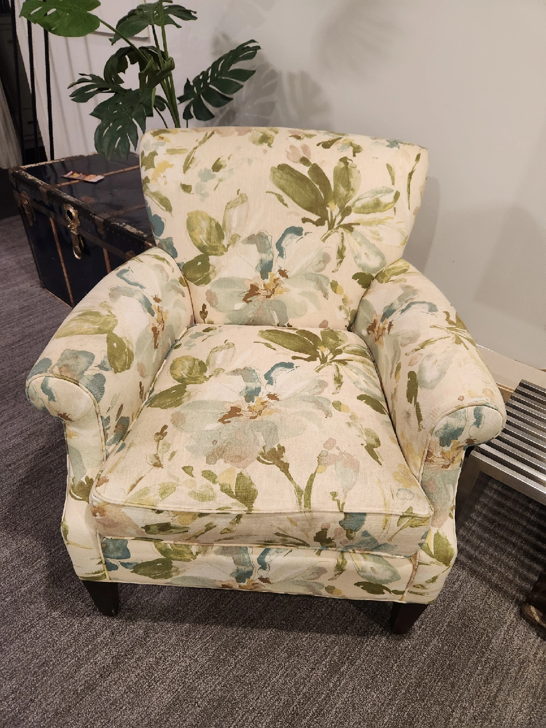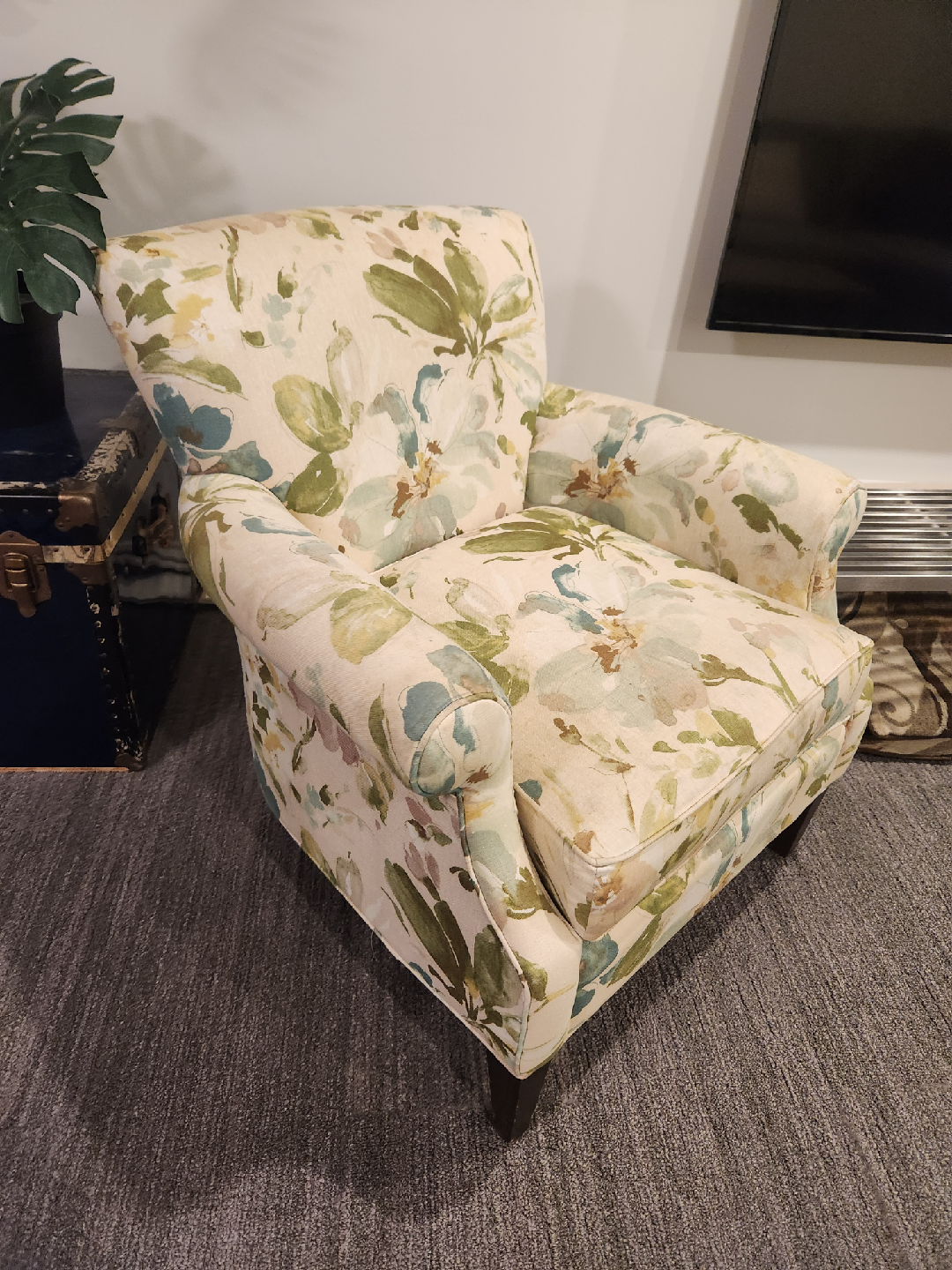 Floral armchair, perfect as an accent piece! It's in good condition, could use a clean if I don't get around to it first. Has a charming floral pattern for a cozy feel. There is a small tear on the arm.