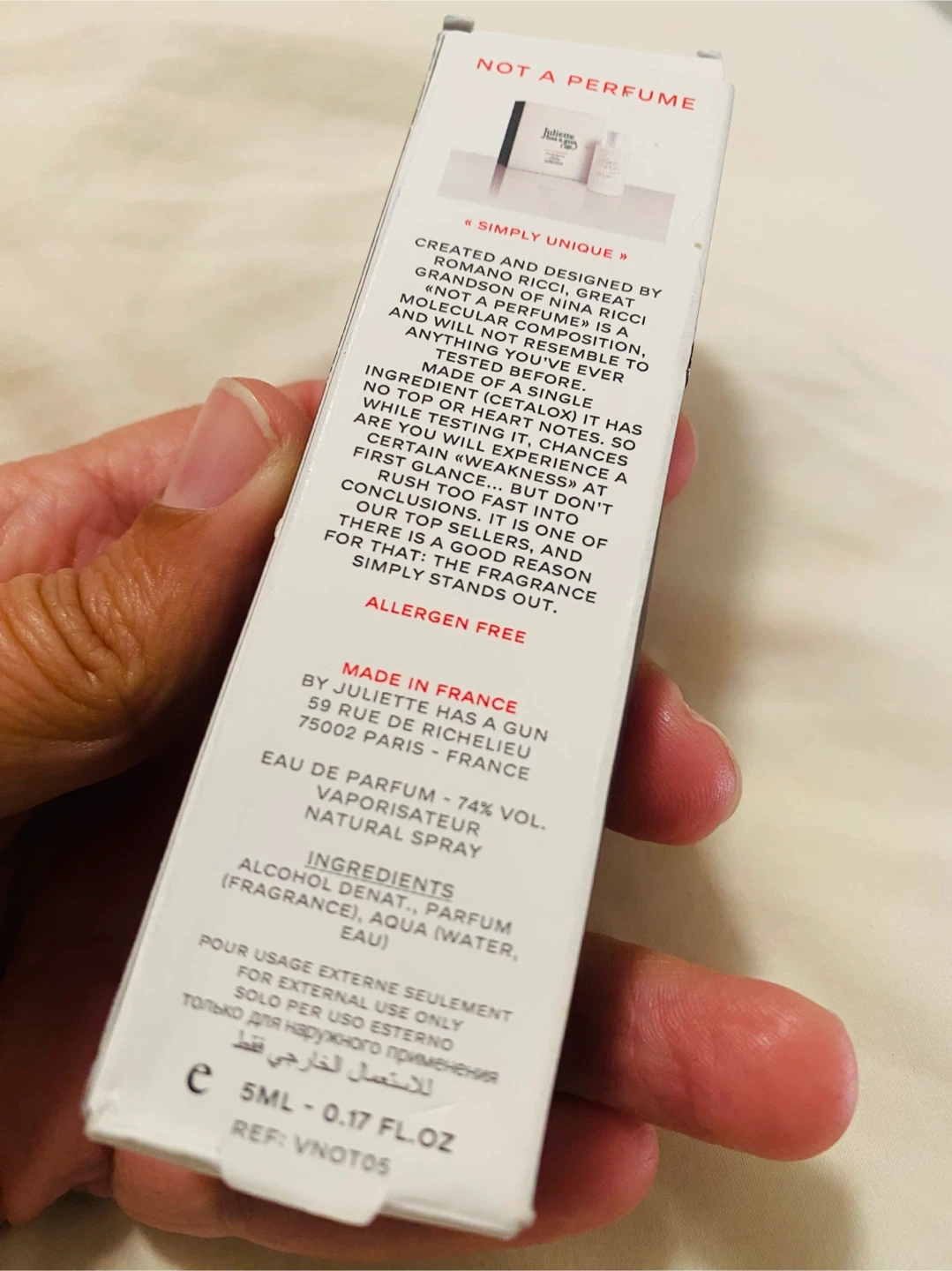 Selling a 5mL sample of Juliette Has a Gun's "Not a Perfume" fragrance. It's a unique and allergen-free scent made in France with a minimalist composition, perfect for those who prefer a clean and simple fragrance.