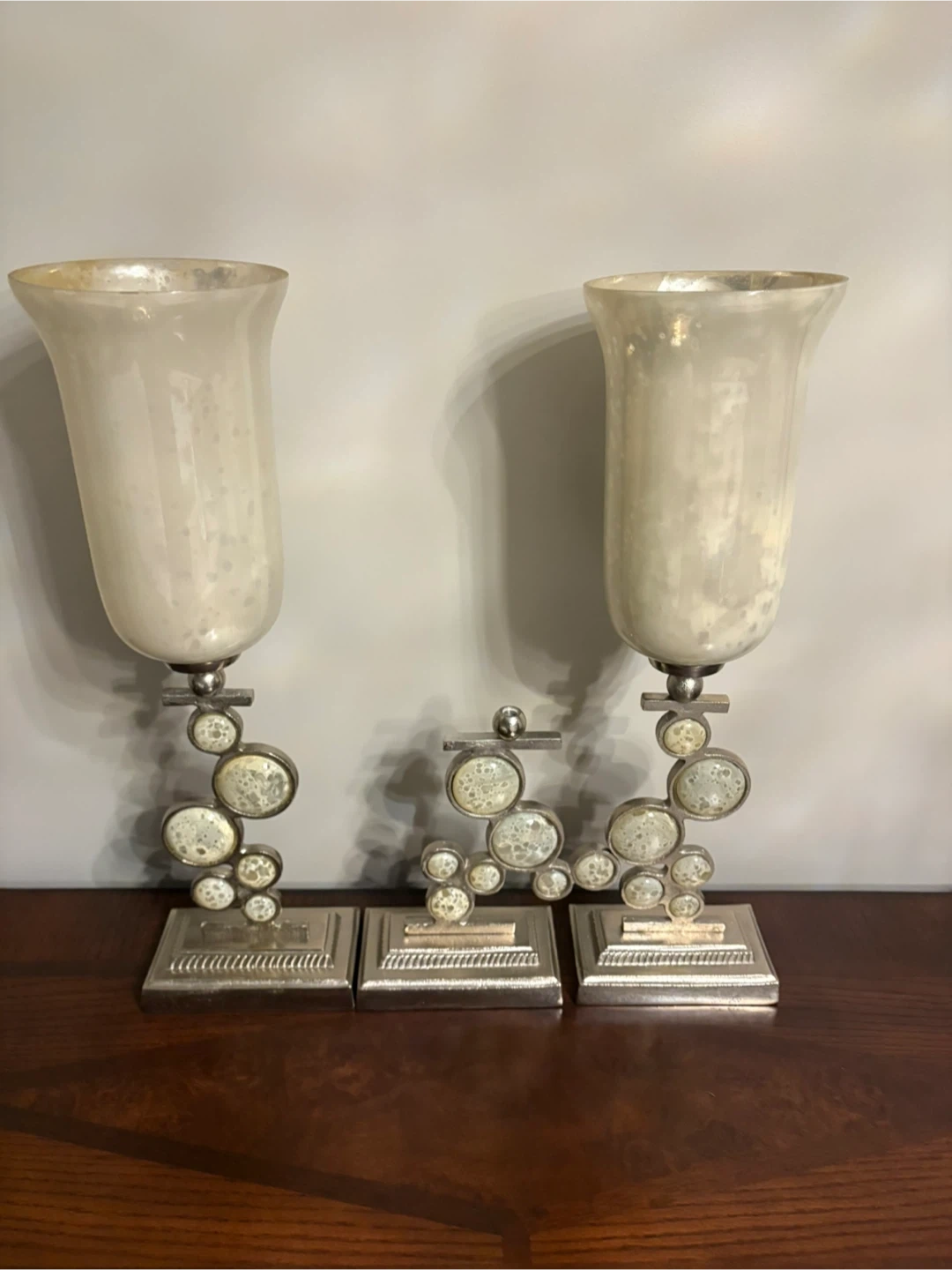 42Selling a set of three decorative candle holders. They have a unique design with a glass hurricane shade and a metal base with decorative circles. They would look great on a table or mantel!