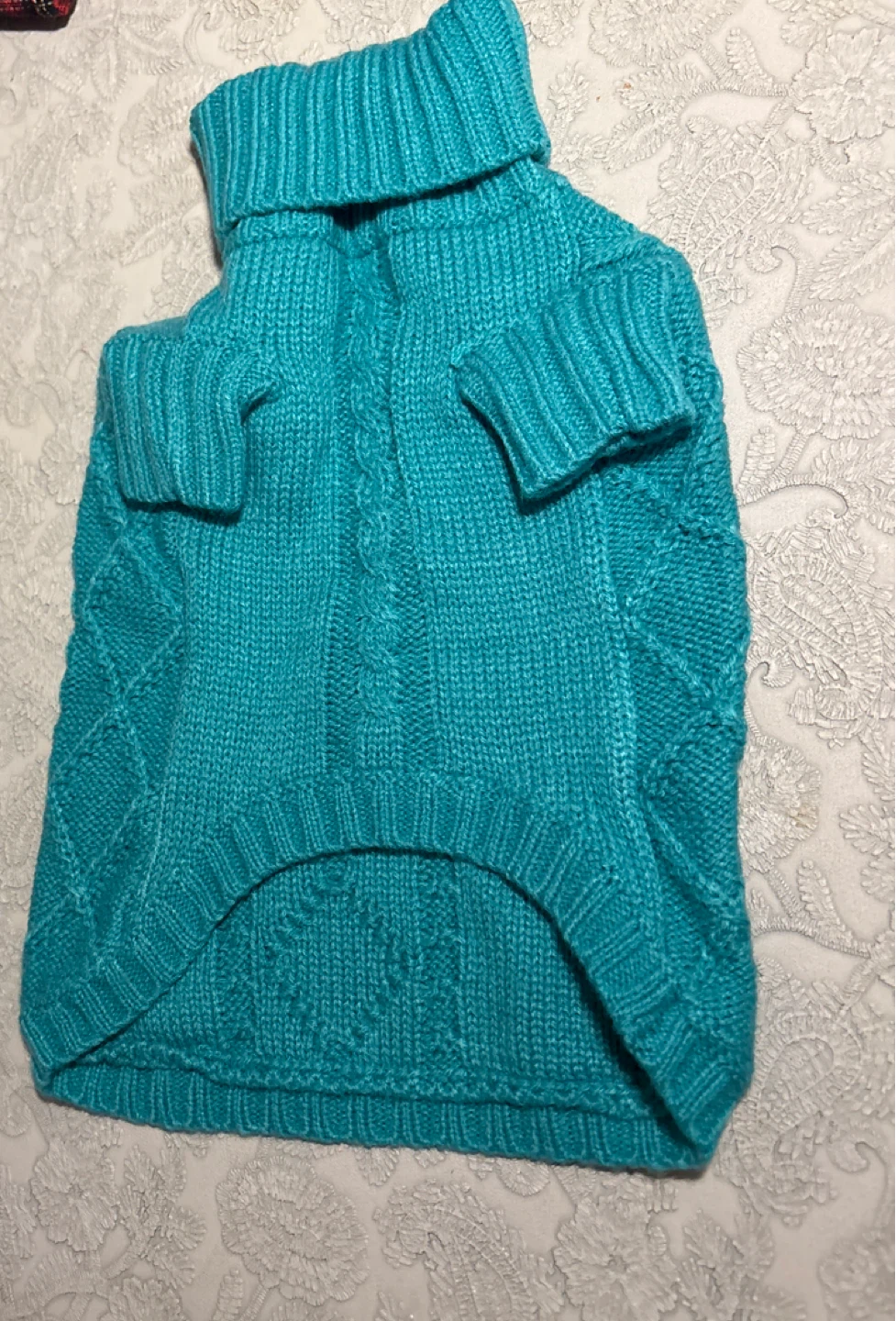 Cozy turquoise knit dog sweater to keep your furry friend warm! It's in great condition and ready for those chilly Canadian walks