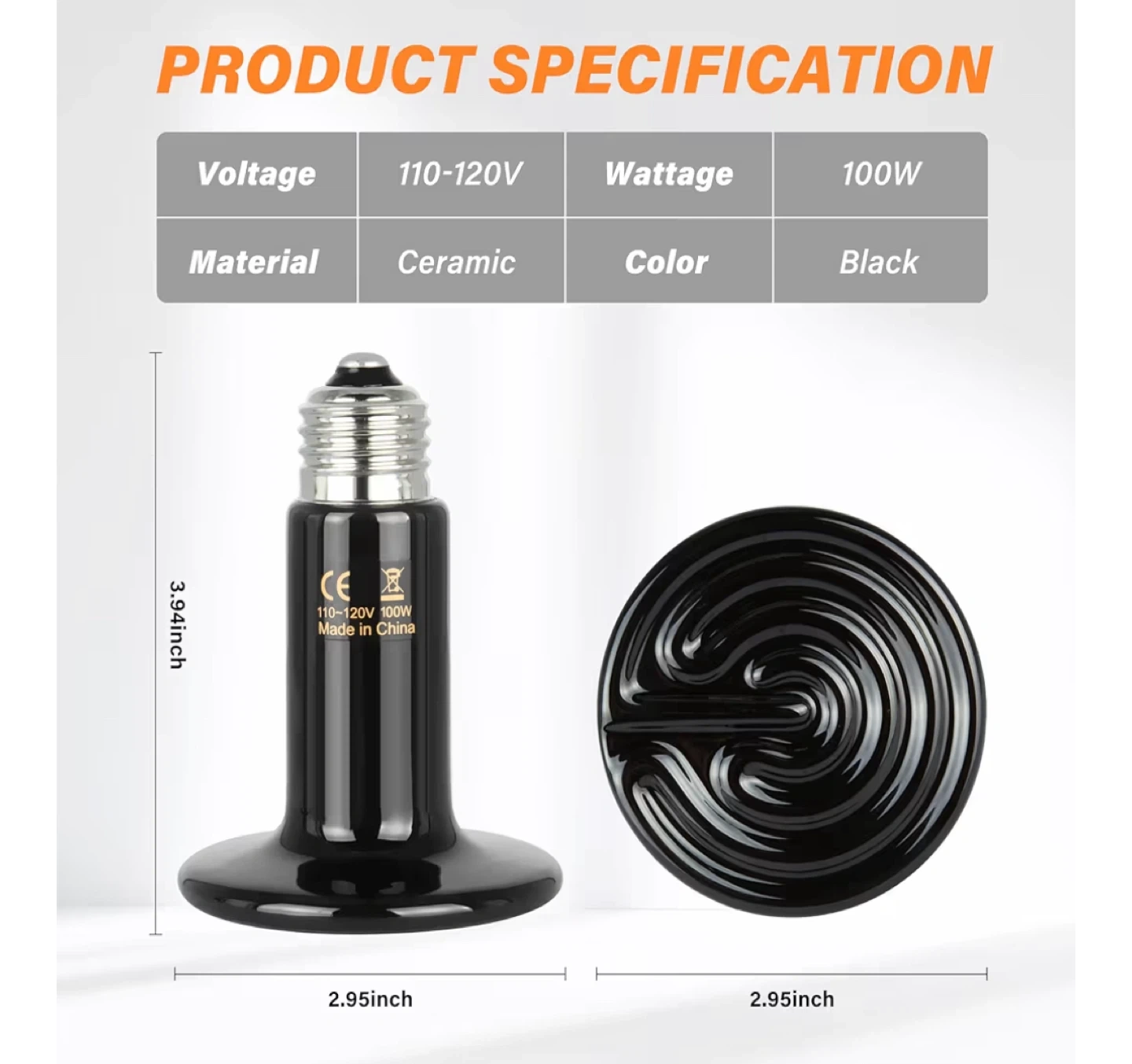 Selling a 2-pack of ceramic reptile heat lamps! They're black and made of ceramic. Each lamp is 100W and operates at 110-120V. The lamps are 3.94 inches tall and 2.95 inches wide