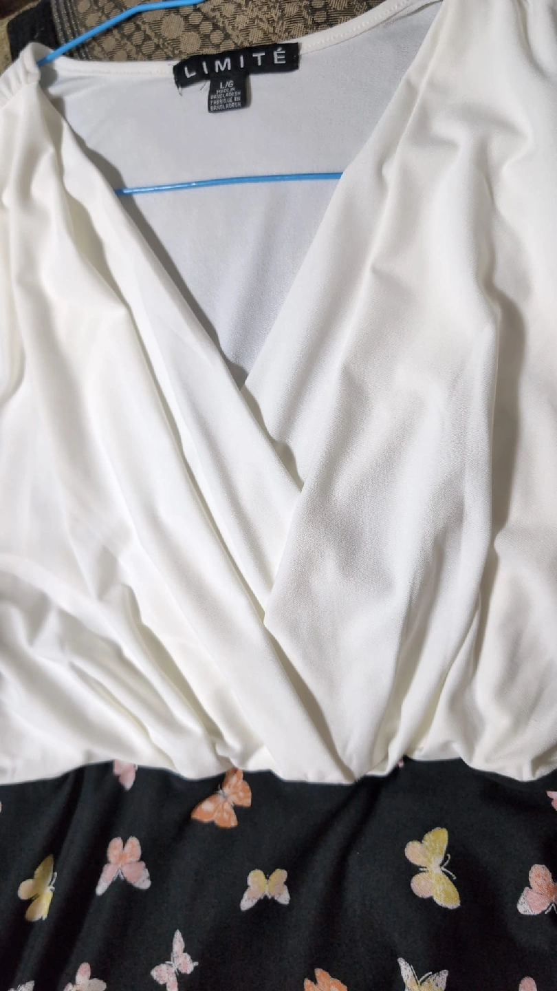 35This is a Limite dress in size L/G. It features a white top and a black skirt with a butterfly print. Originally bought for $99.99!