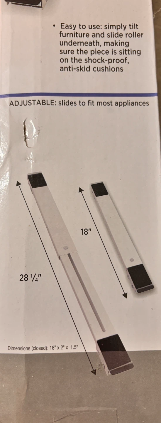 These furniture movers are easy to use; simply tilt the furniture and slide the roller underneath, making sure the piece is sitting on the shock-proof, anti-skid cushions. They're adjustable and slides to fit most appliances. The dimensions when closed are 18" x 2" x 1.5".
