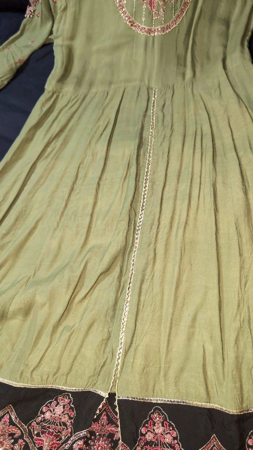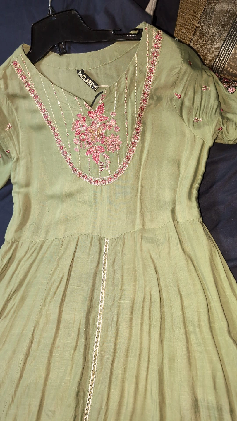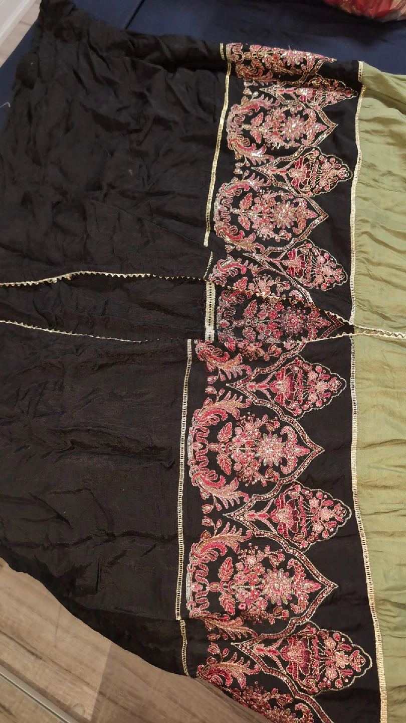 35Beautiful green dress from De Clare with lovely embroidery details! It features a unique design with a blend of green and black fabric, adorned with intricate floral patterns. Perfect for a special occasion or to add a touch of elegance to your wardrobe