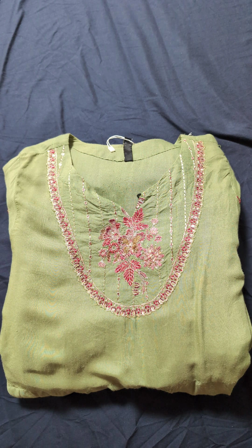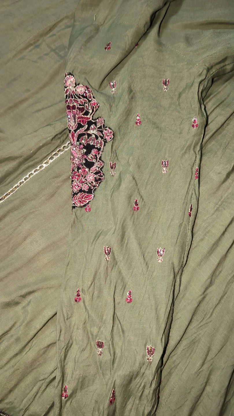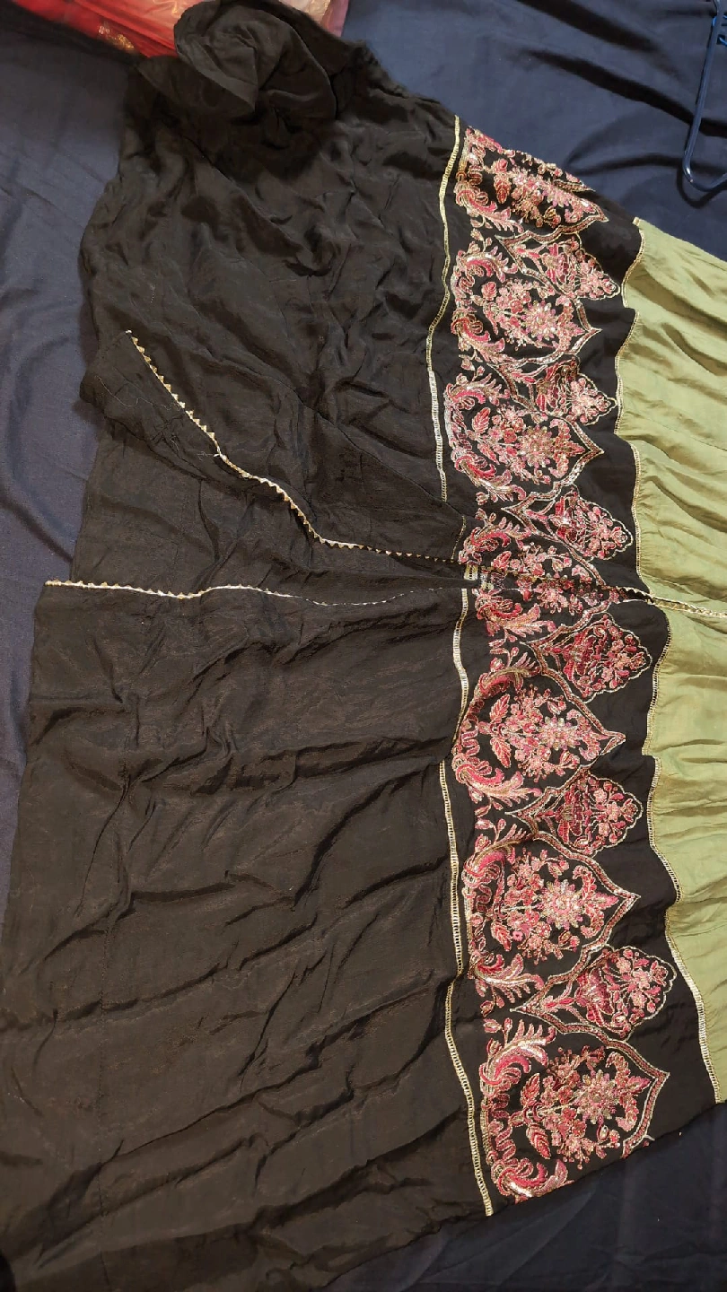 35Beautiful green dress from De Clare with lovely embroidery details! It features a unique design with a blend of green and black fabric, adorned with intricate floral patterns. Perfect for a special occasion or to add a touch of elegance to your wardrobe