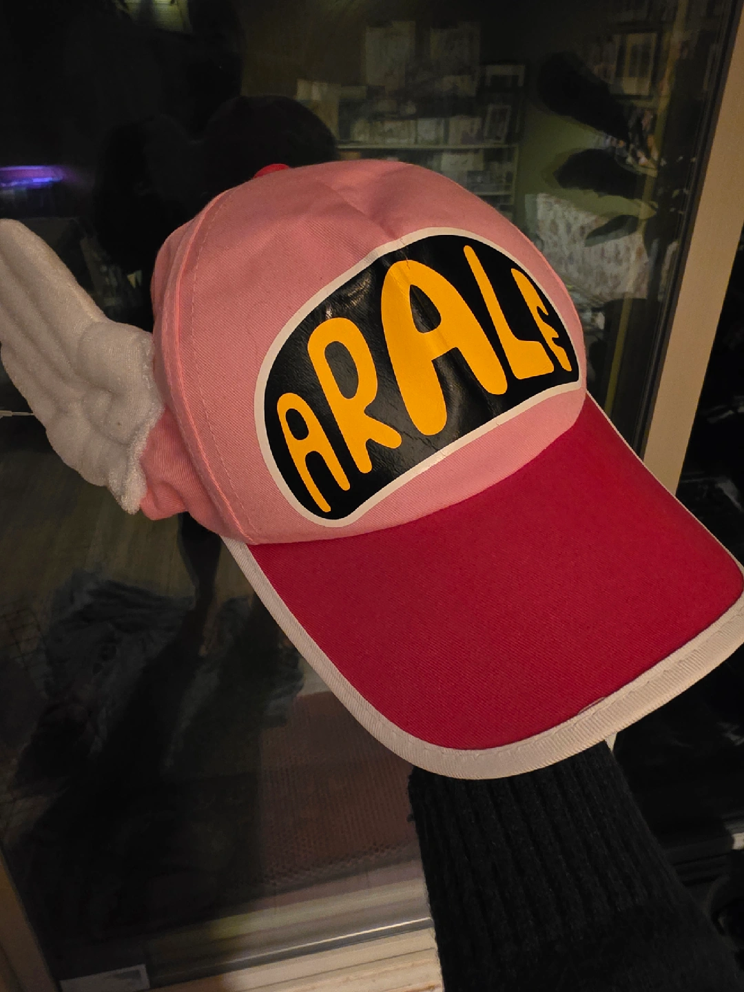 Check out this adorable Dr. Slump Arale hat! It’s pink and red with Arale's name on the front and cute little wings on the sides. The material is cotton and polyurethane. Perfect for any fan of the series!
