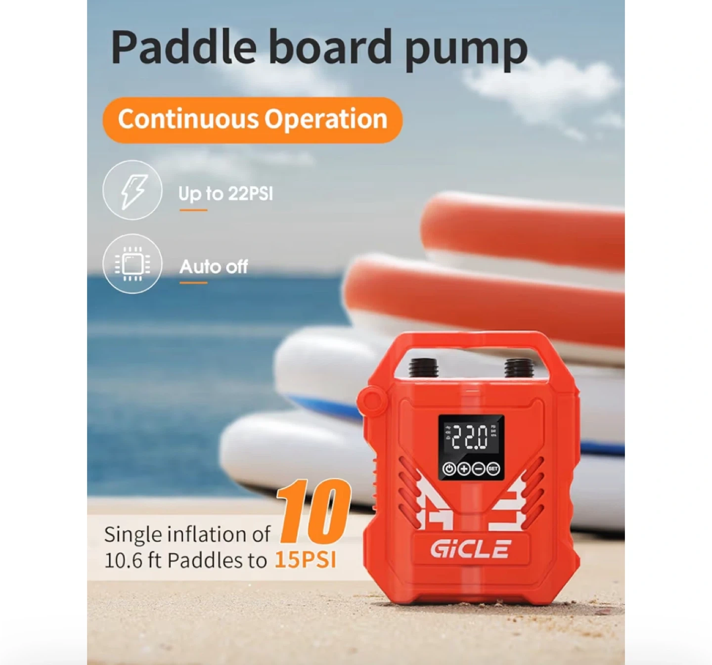 Selling a brand new GICLE paddle board pump! It's never been used and comes in the original box. Features: - Continuous operation - Up to 22 PSI - Auto off - Single inflation of 10.6 ft paddles to 15 PSI