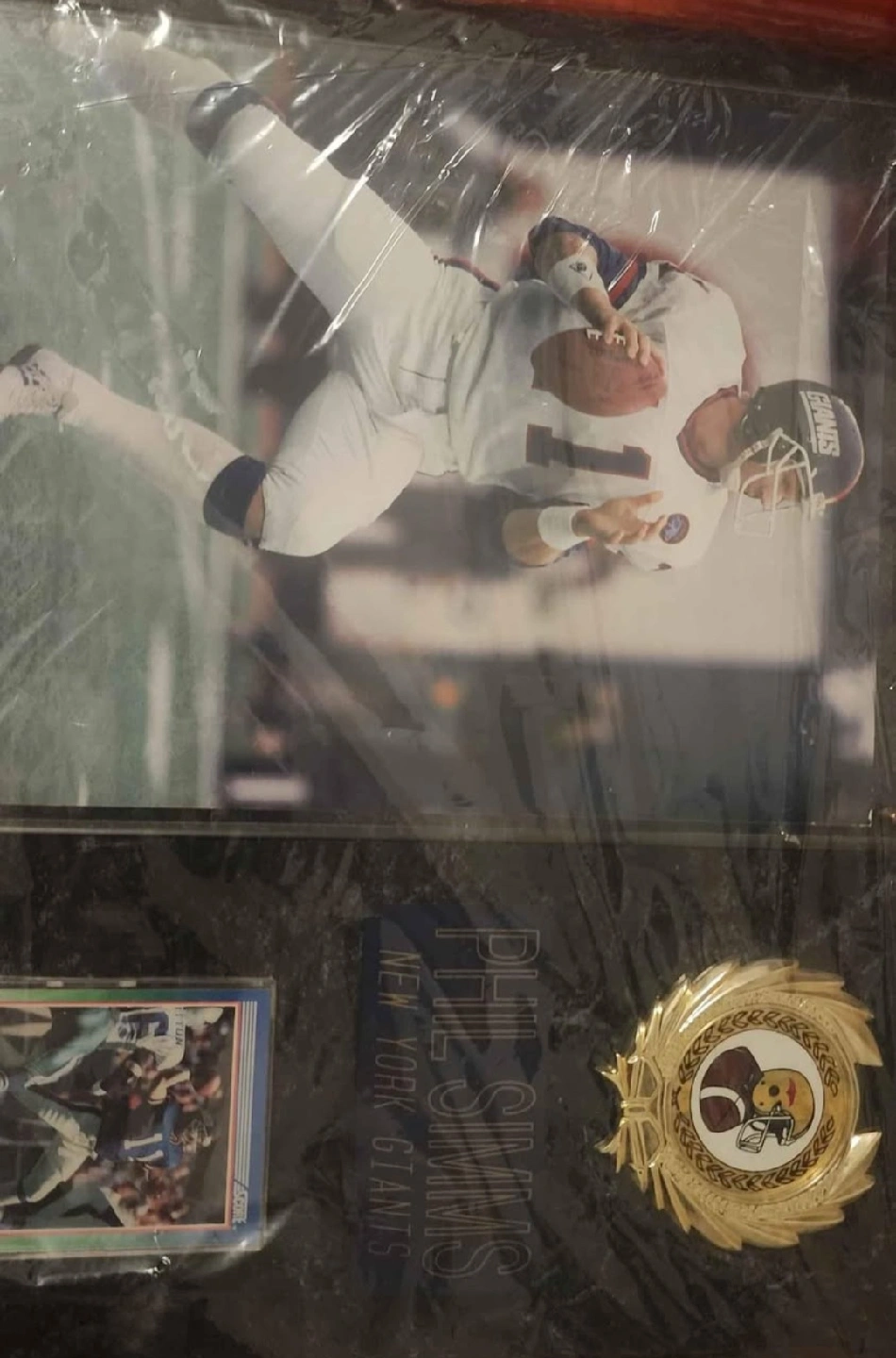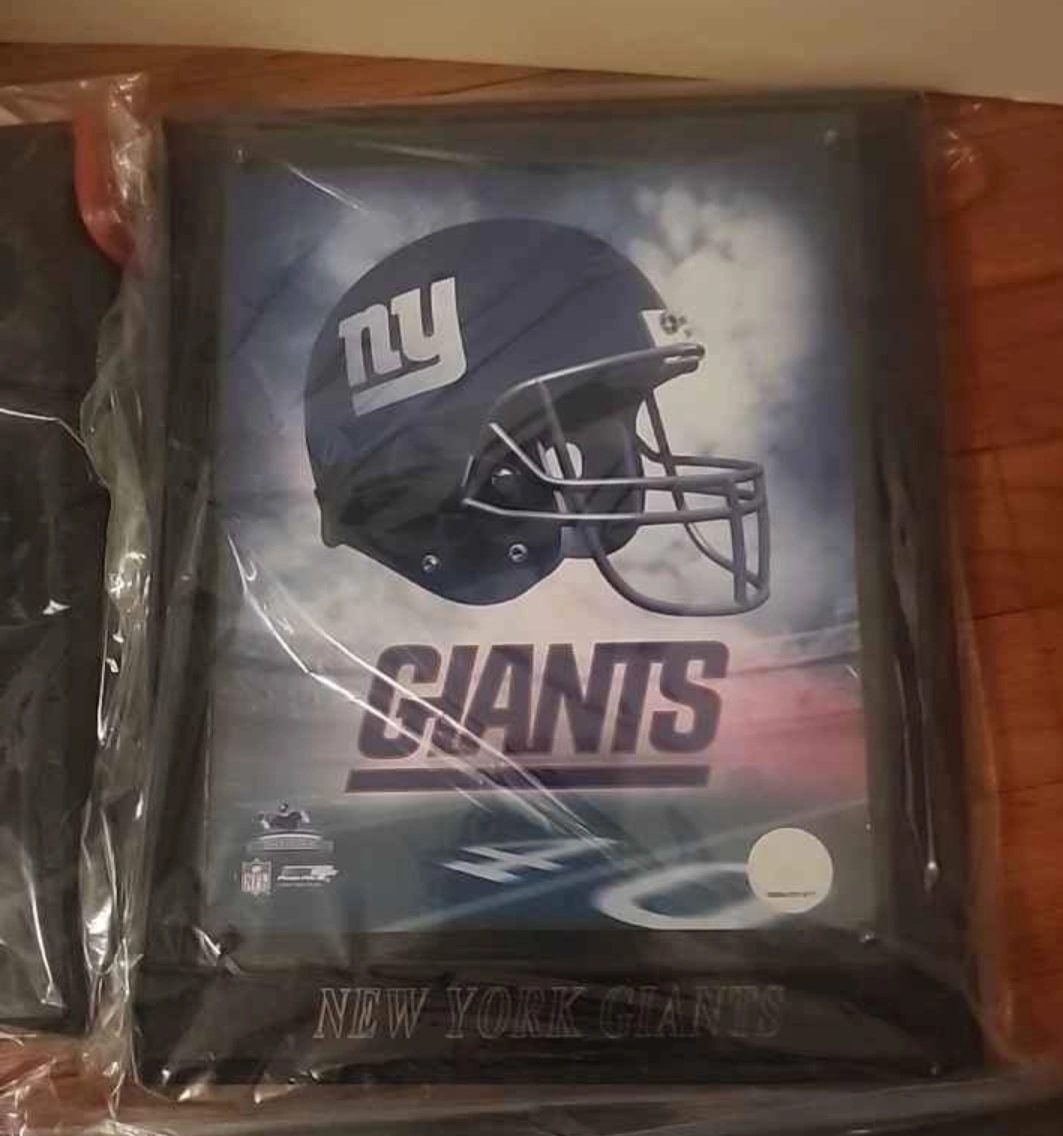23Selling a collection of New York Giants memorabilia. Includes framed photos of players like Tiki Barber and Phil Simms, along with trading cards and decorative medallions. Great for any Giants fan!