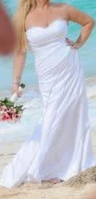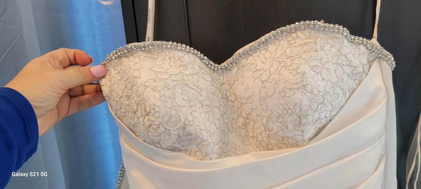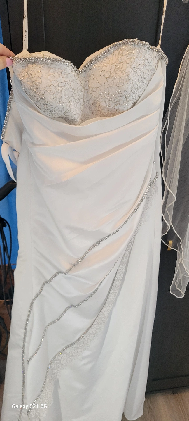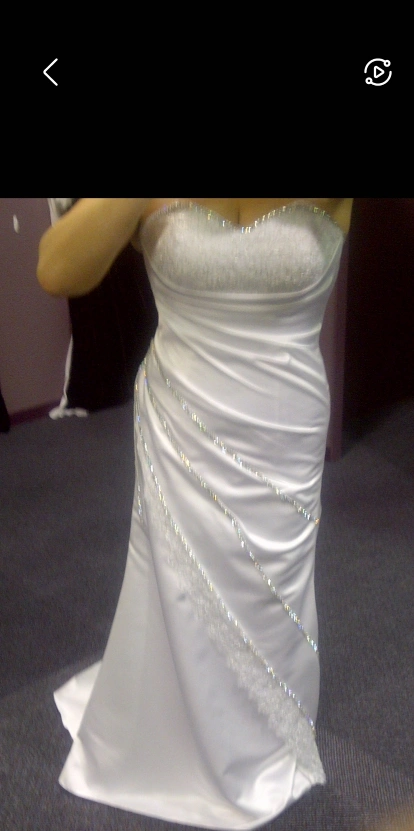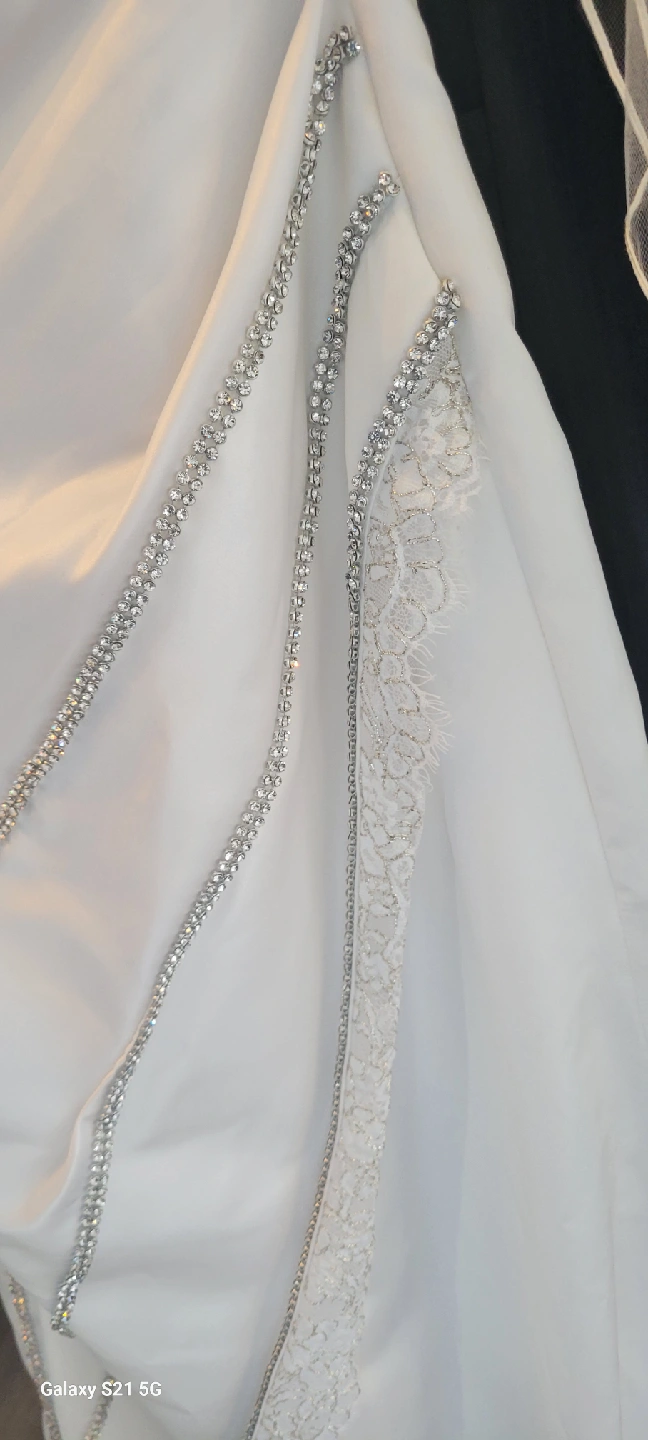 Beautiful white custom wedding dress with delicate diamond detailing. The dress features lace and rhinestone accents. It has a sweetheart neckline and a fitted bodice. Perfect for your special day! size 10 but adjustable.
