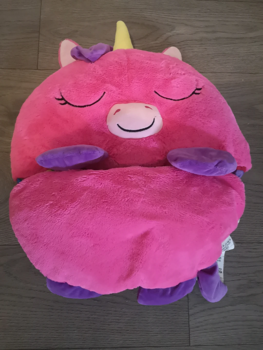 Snuggle up in this adorable rainbow unicorn sleeping bag! It's perfect for sleepovers, camping, or just lounging around at home. The sleeping bag is in great condition and features a soft, plush unicorn head and a colourful rainbow pattern