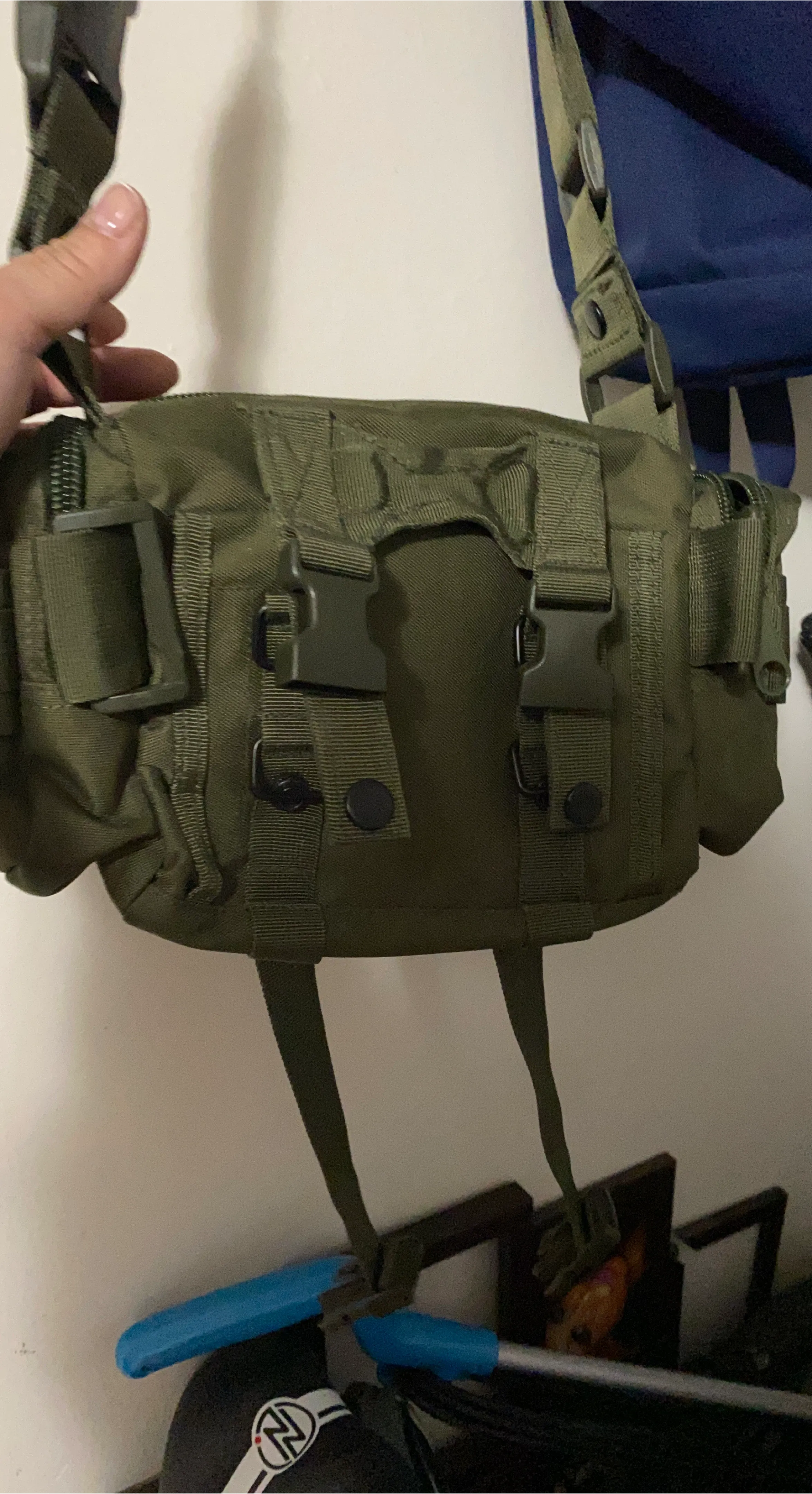 Selling an olive green tactical chest rig. It looks to be in good condition with lots of straps and pouches. Perfect for outdoor activities or tactical gear enthusiasts!