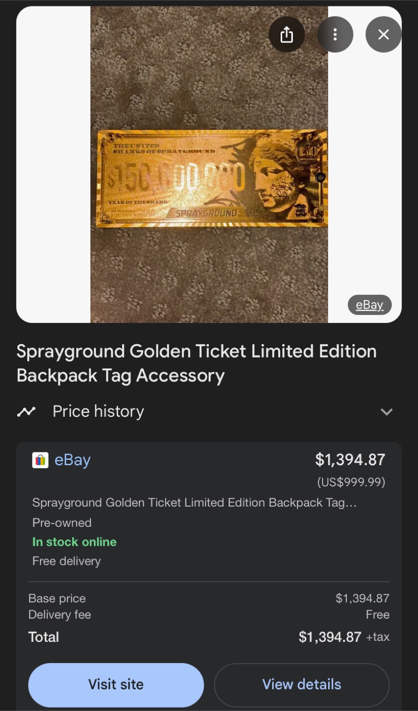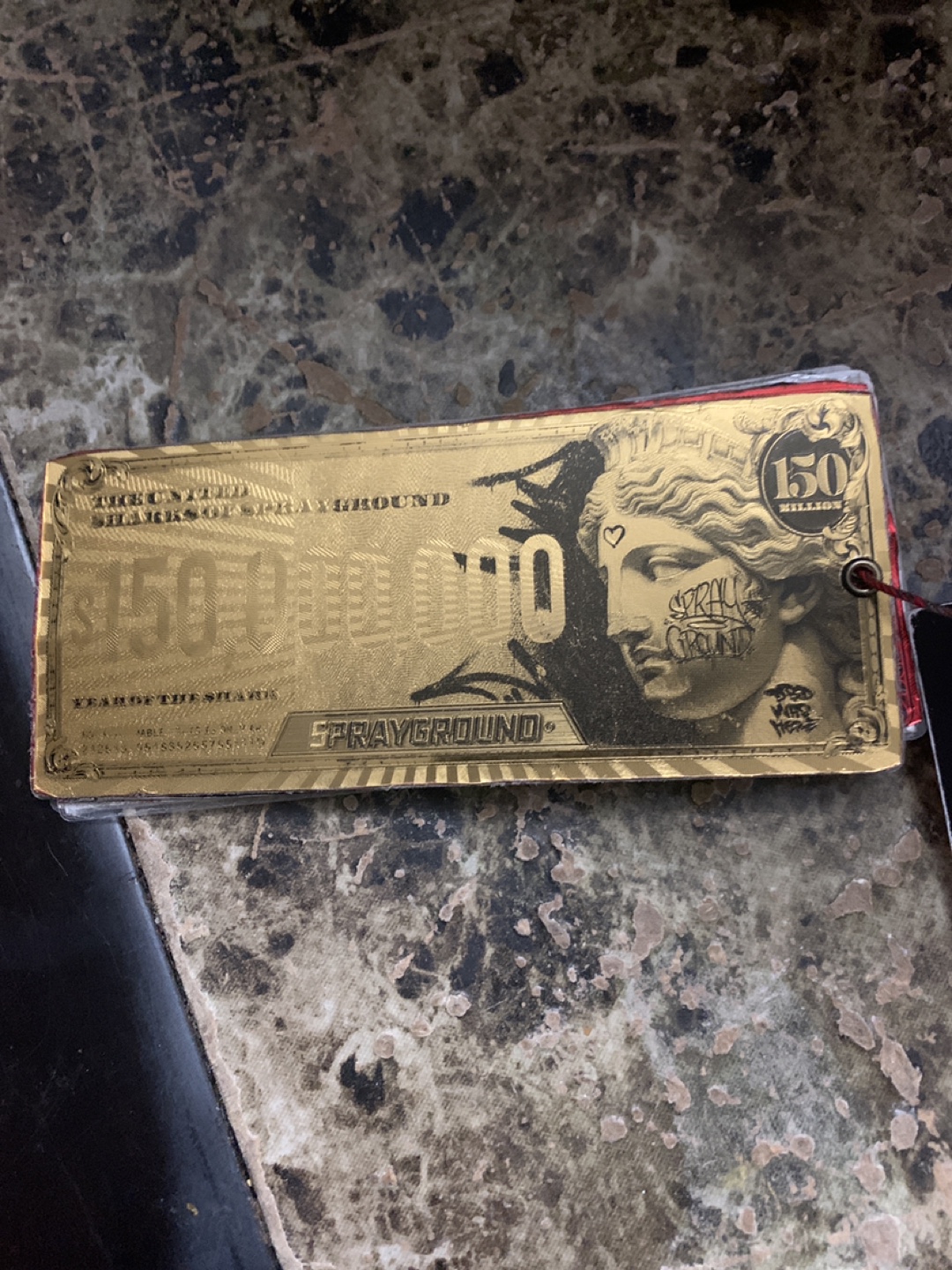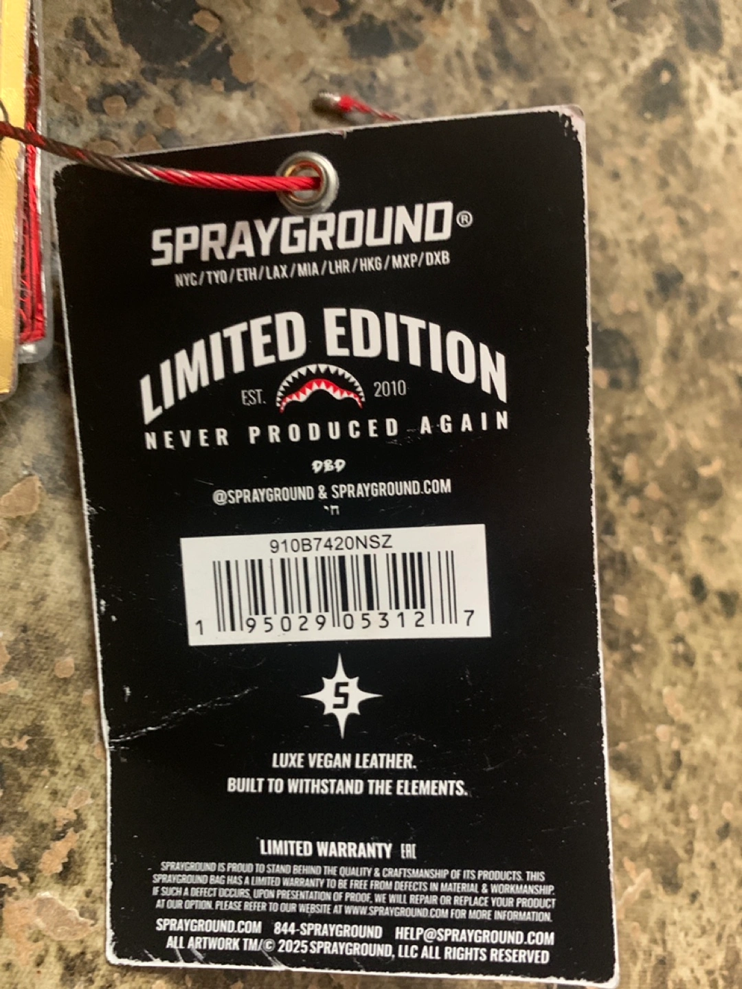 Selling a Sprayground Golden Ticket Limited Edition tags. It's a cool accessory for your backpack or bag. The tag features a unique design and is built to withstand the elements with luxe vegan leather. It's part of a limited edition collection from Sprayground!