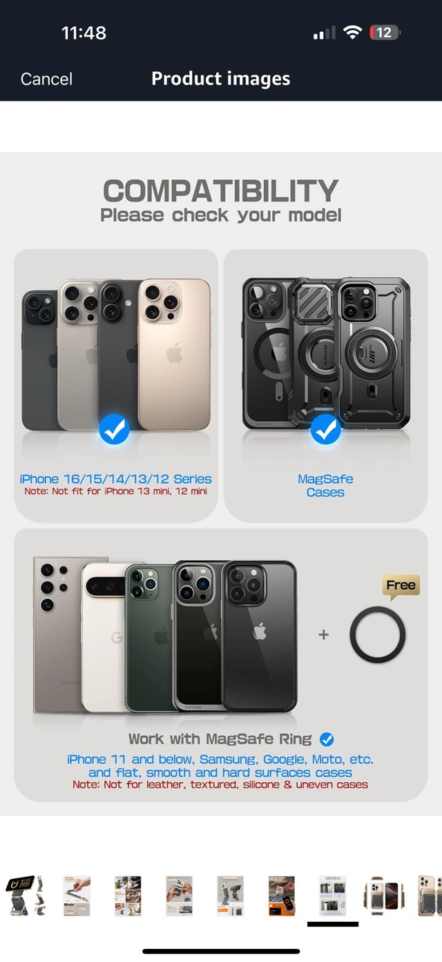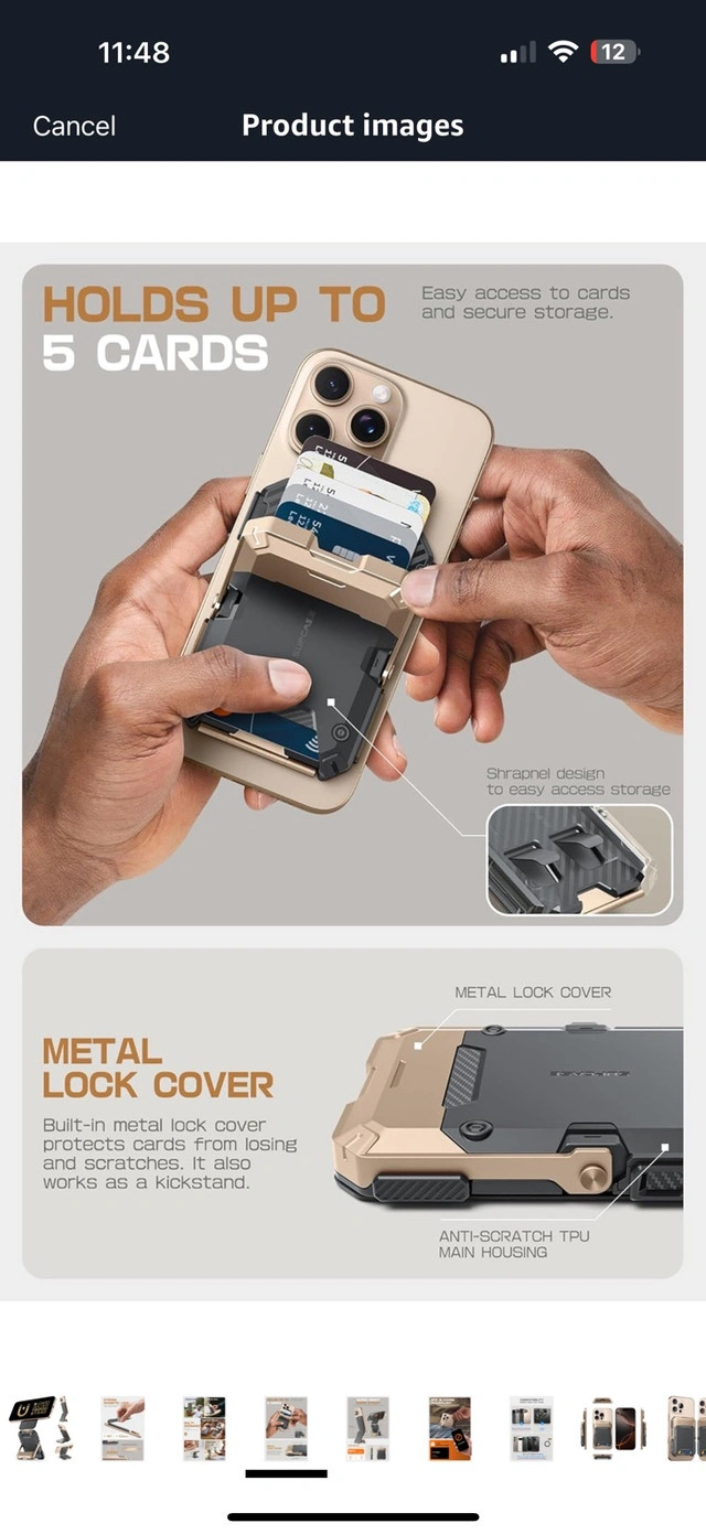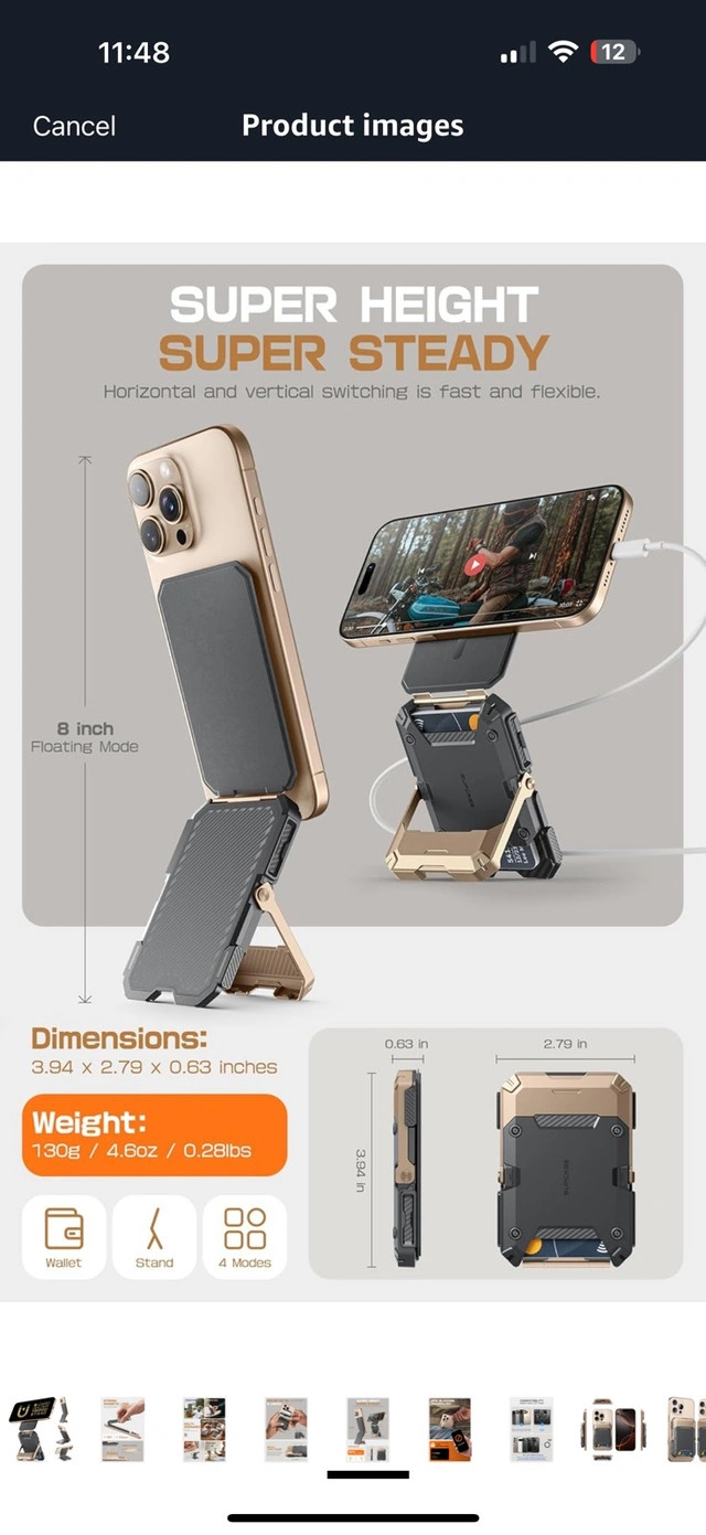60Tried it on and realized it’s not a good fit for my case which is already also bulky, immediately repackaged back into box. Product is basically brand new. This used Magsafe wallet case with stand is designed for iPhone 12, 13, 14, 15 and 16 series iphones, offering both convenience and protection. The case features a built-in stand for easy viewing and a secure wallet to hold up to 5 cards. Its RFID blocking technology protects against card demagnetization and identity theft. Specifications: * Compatibility: iPhone 12/13/14/15/16 Series * Material: Anti-scratch TPU main housing with metal lock cover * Features: Card holder (up to 5 cards), built-in stand with 4 modes, RFID shielding * Dimensions: 3.94 x 2.79 x 0.63 inches * Weight: 4.6oz / 0.28lbs