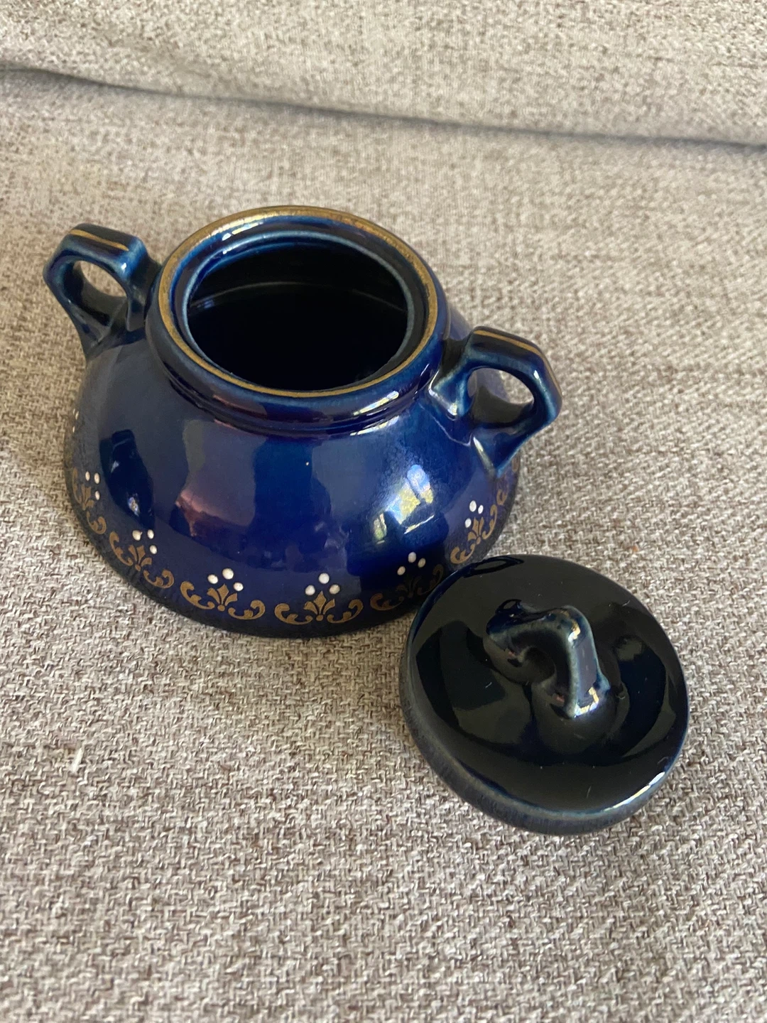 Here's a charming little set that would look great on any table! It includes a small sugar bowl with a lid and a matching creamer, both in a lovely dark blue ceramic with gold trim and white detailing.