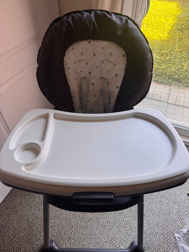 I am selling a Graco Table2Table LX 6-in-1 Highchair, perfect for your growing child. This versatile highchair adapts to six different stages, from infant highchair to a portable booster. The seat is in good condition, and it comes with a removable tray for easy cleaning. Key Features: * 6-in-1 design adapts to your child's needs * Removable and washable tray insert * Adjustable height positions * Convertible to a toddler booster seat This highchair offers convenience and flexibility for mealtime and beyond. If the ad is up, it's available!
