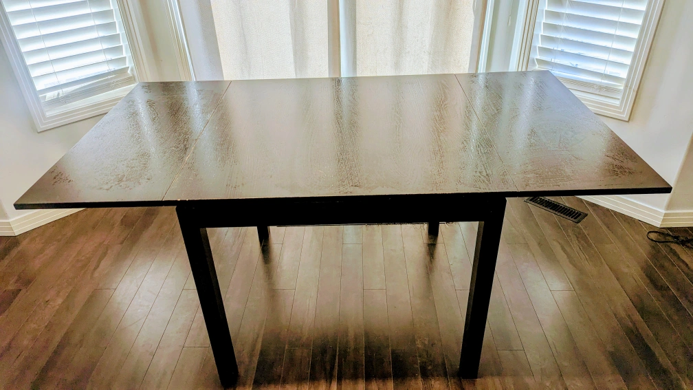 45Dark brown extendable square dining table. It's in good condition, has minor scruffs and needs a fresh coat of stain. It's perfect for smaller spaces that can convert to smaller size or can extend easily to accommodate upto 6 people.