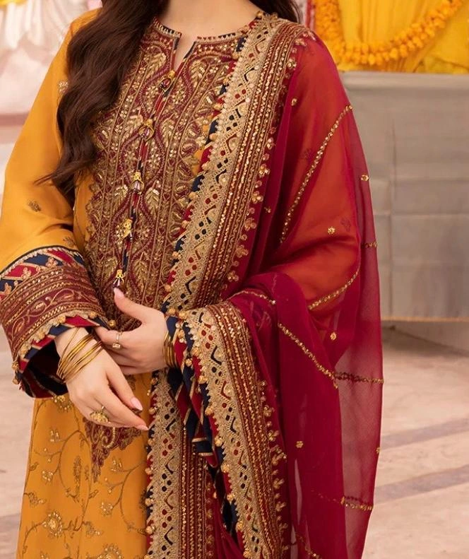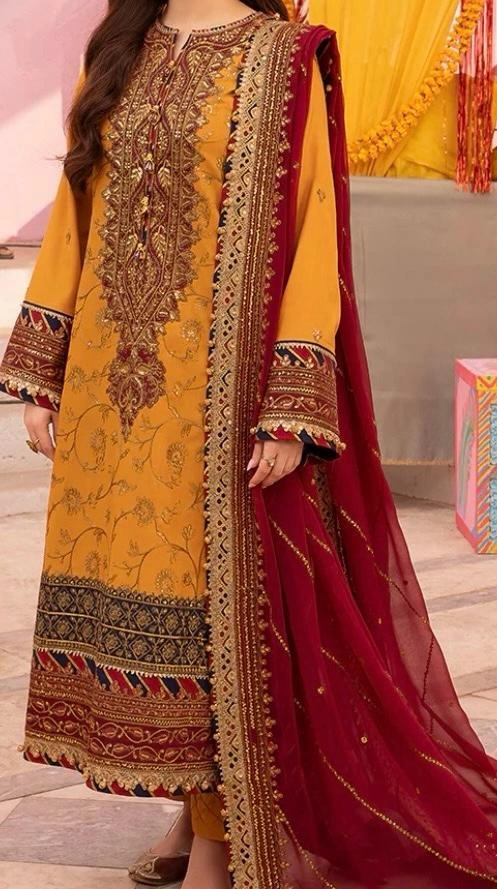 Beautiful salwar kameez suit with intricate embroidery! The colour is a lovely mustard yellow, and it comes with a matching red dupatta. Perfect for special occasions or adding a touch of elegance to your everyday wear