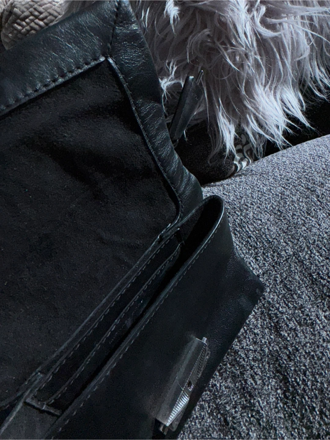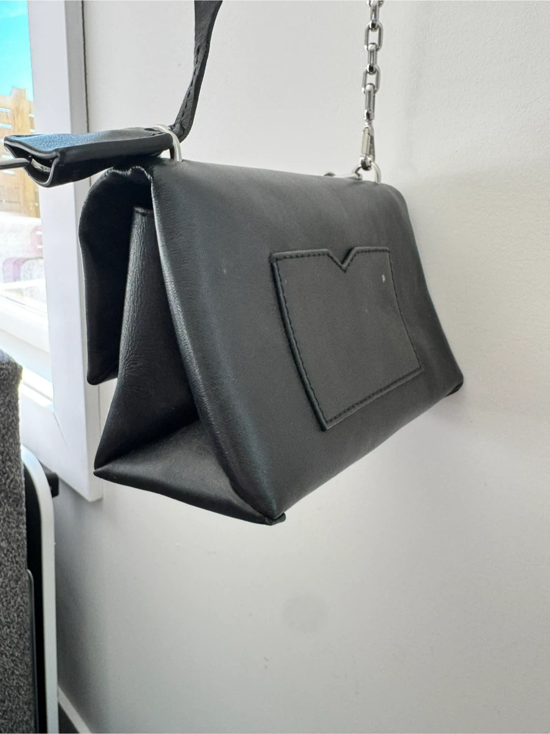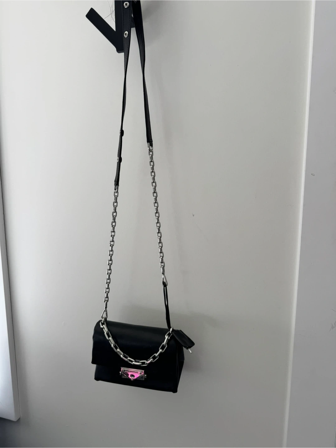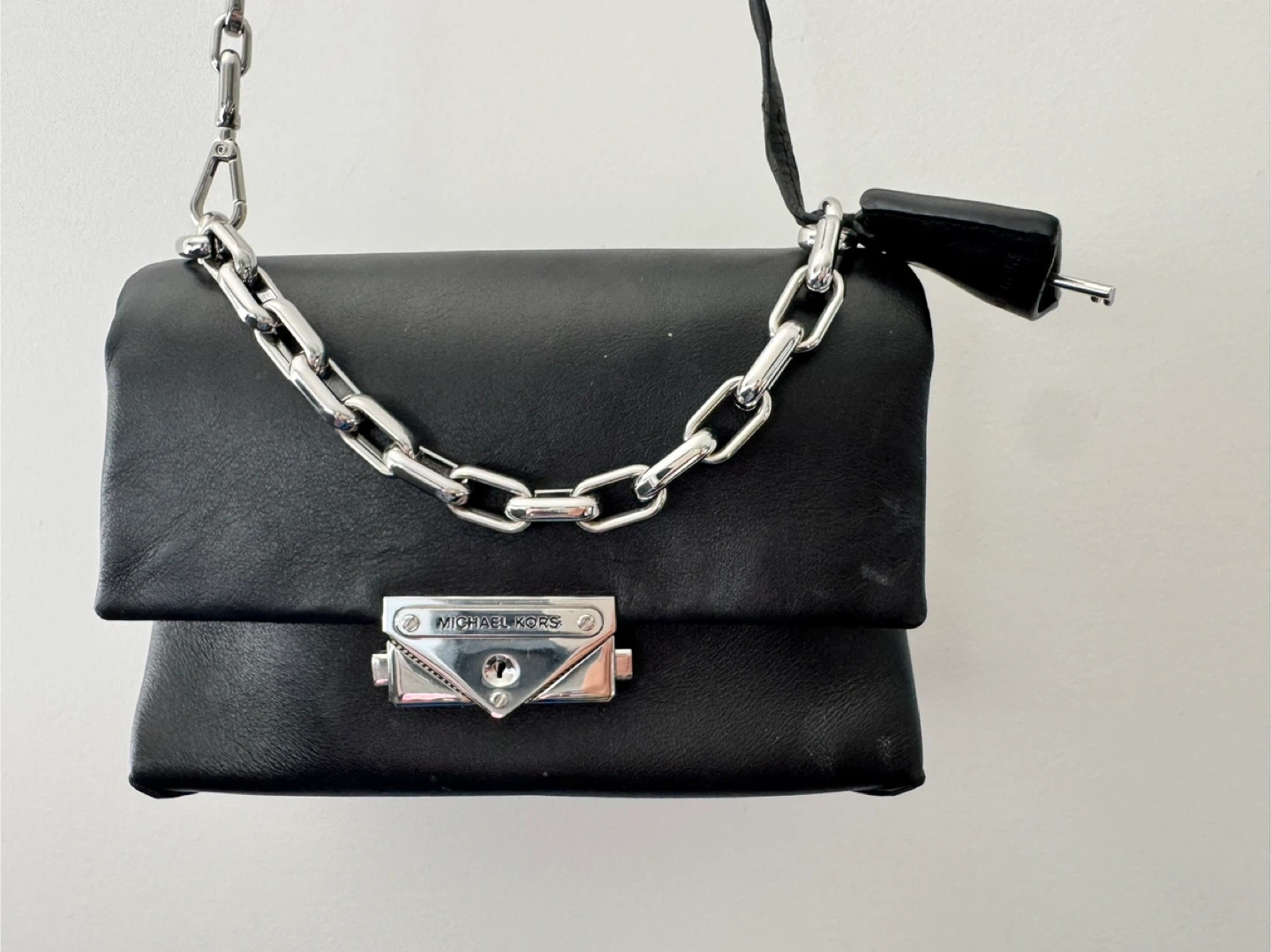 62This is a stylish black leather shoulder bag from Michael Kors. It features a silver chain detail and a unique design. Perfect for adding a touch of elegance to any outfit!