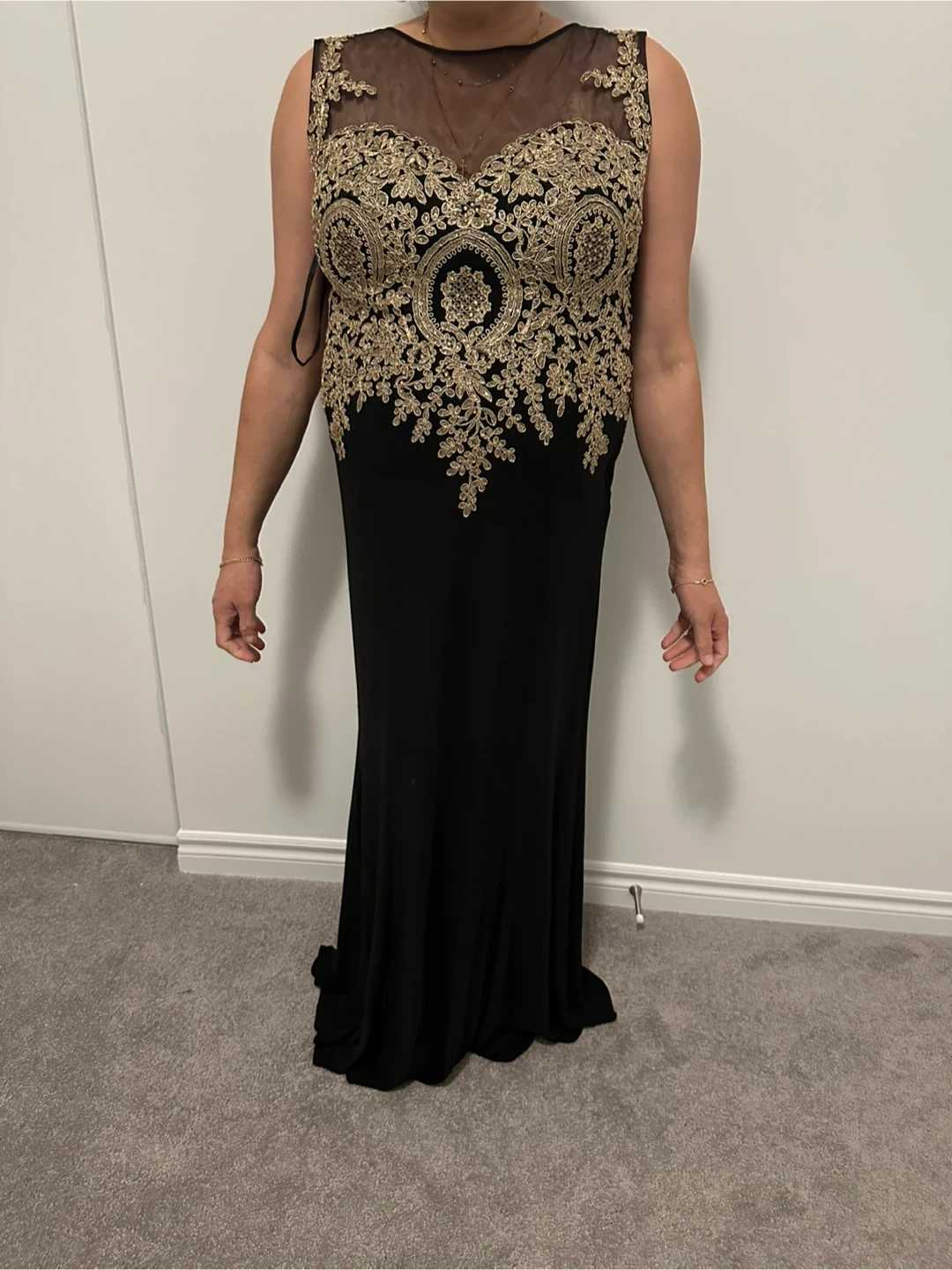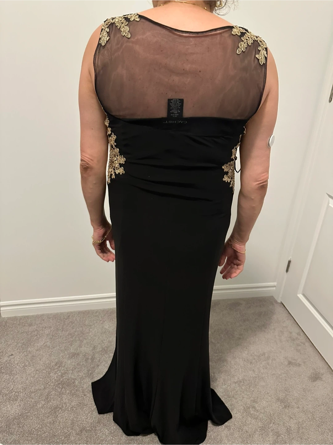 Selling a size 16 beautiful Cachet formal gown! It's black with stunning gold detailing. Perfect for a special occasion.