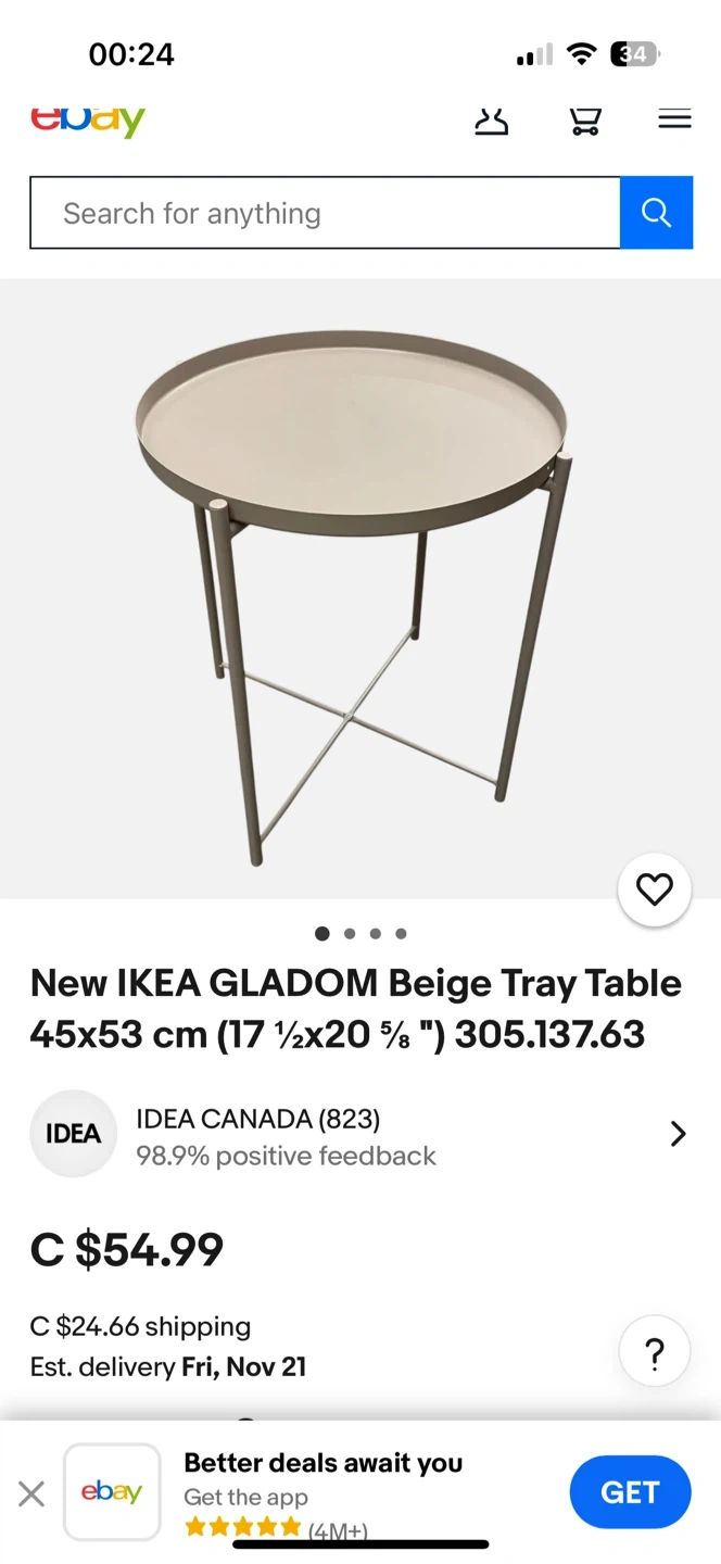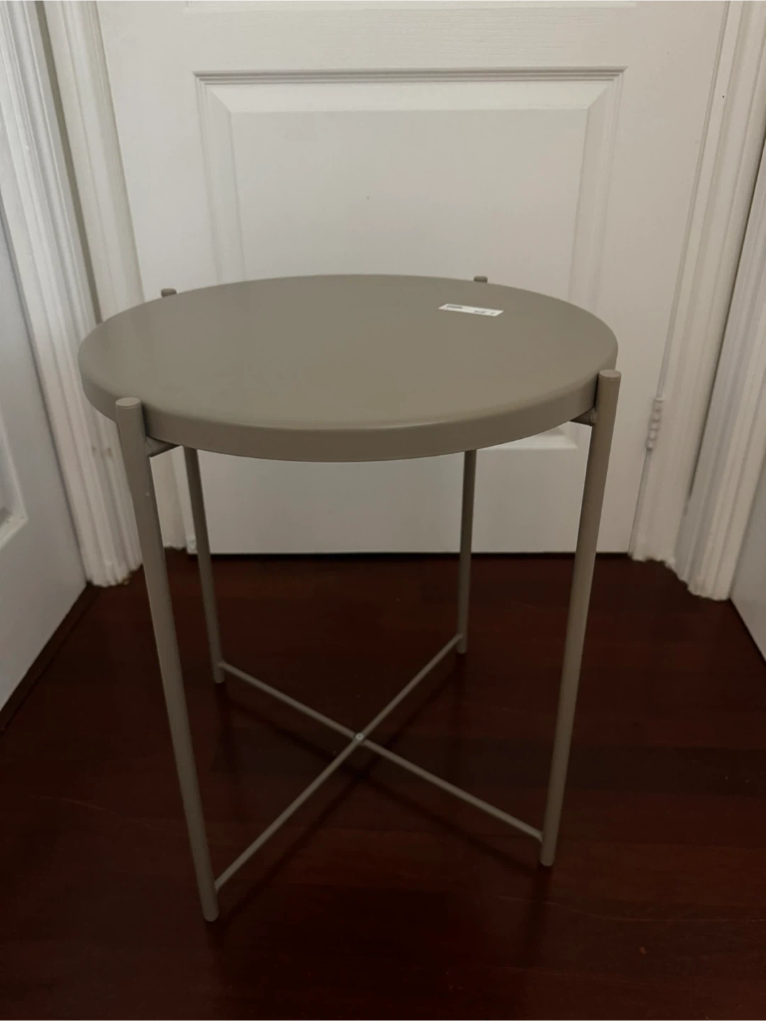 555Ikea Gladom side table, perfect for adding a touch of minimalist style to any room. It features a simple, round design with a smooth, taupe-coloured top and slender metal legs. Being lightweight and easy to move, it is ideal as a bedside table, in a living room, or on a balcony. in like new condition. * Diameter: 45 cm (17 3/4 ") * Height: 53 cm (20 7/8 ") * Max. load: 5 kg (11 lb) $20 Yonge and finch area