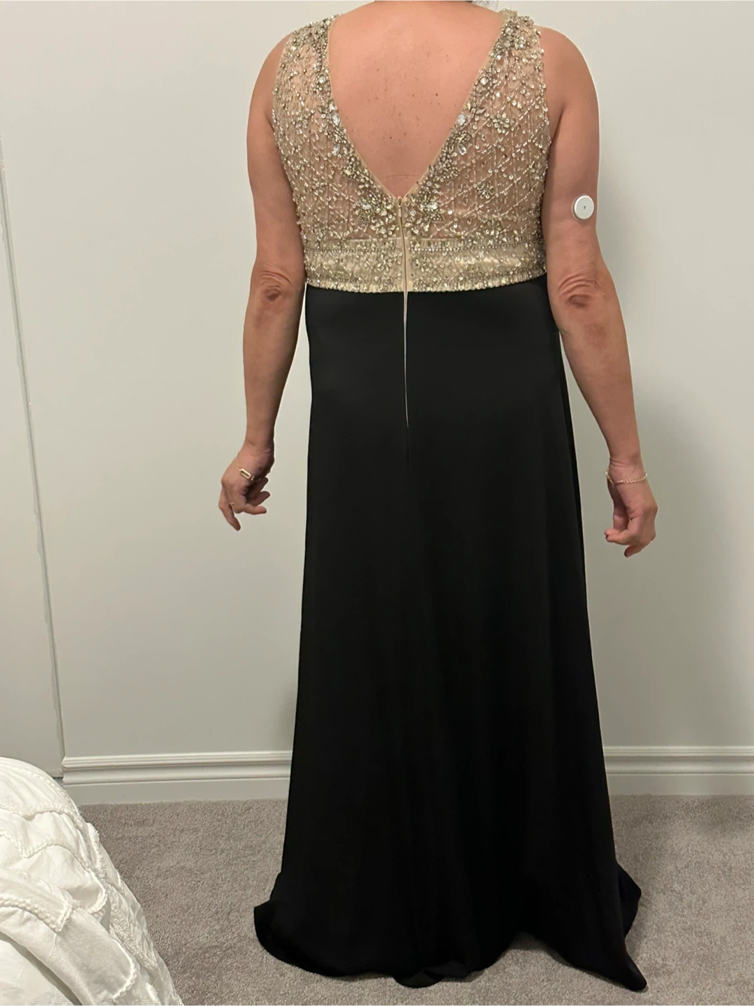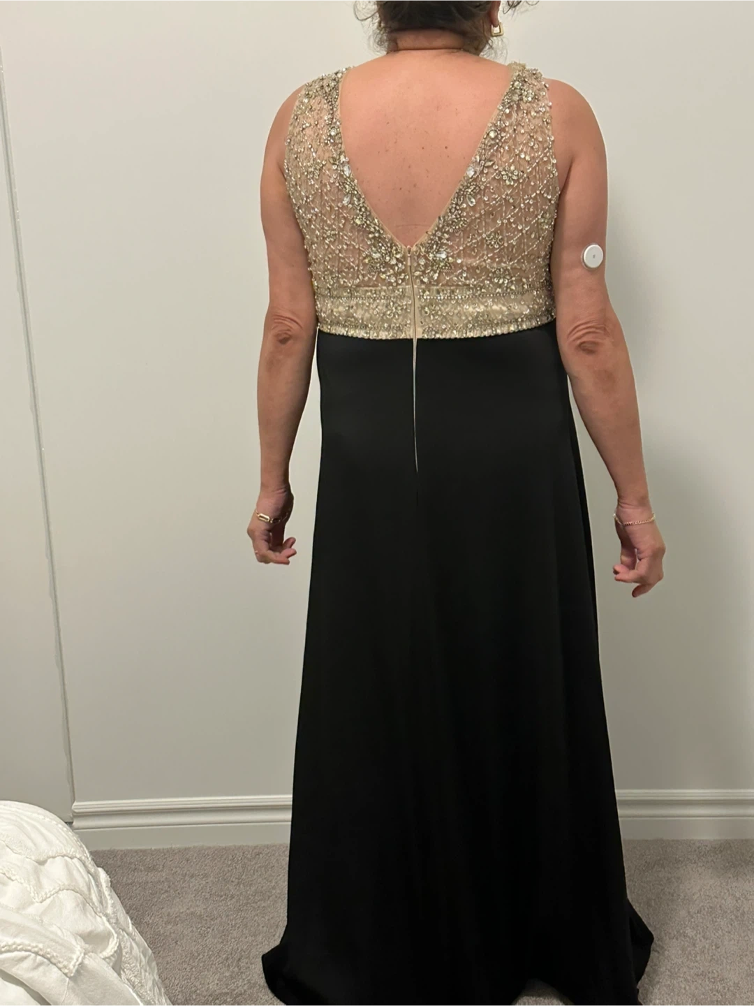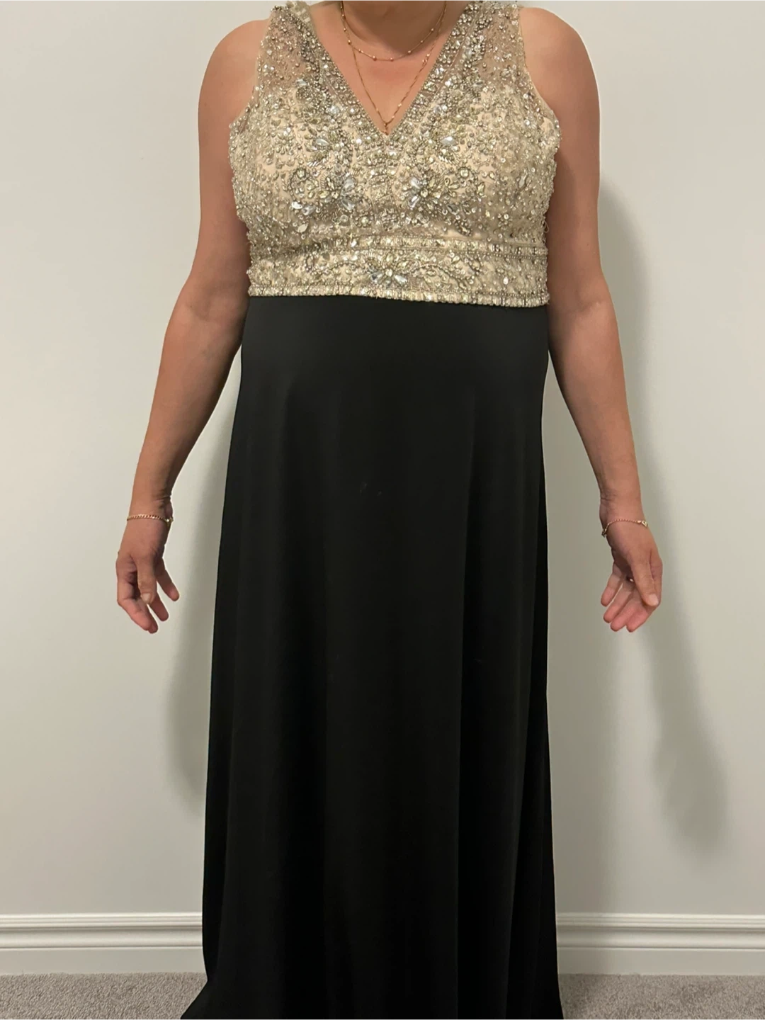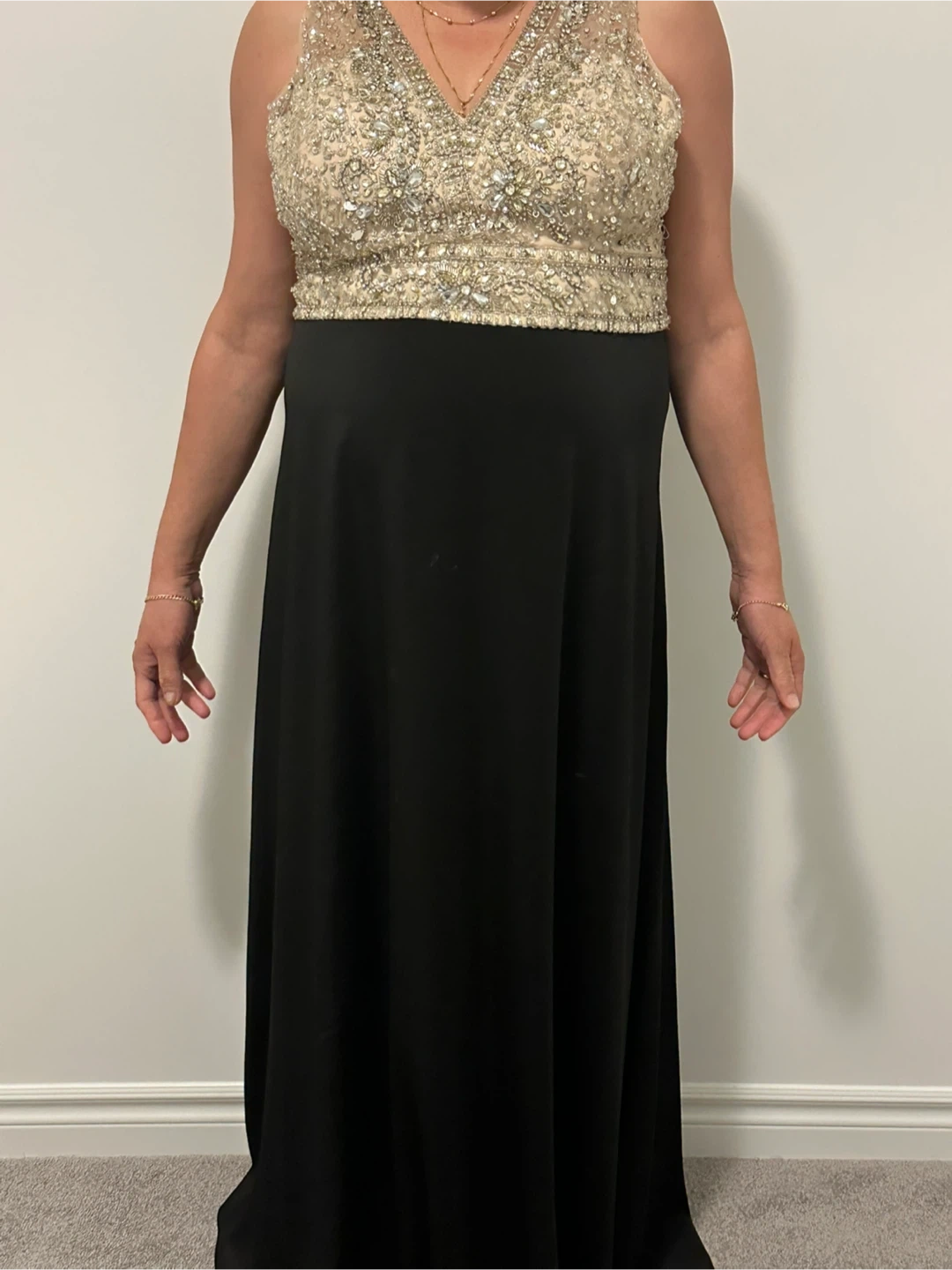 Elegant black and gold evening dress, perfect for a special occasion! The top is beautifully embellished with gold beads, and the skirt flows nicely. It's in great condition and ready for a new home