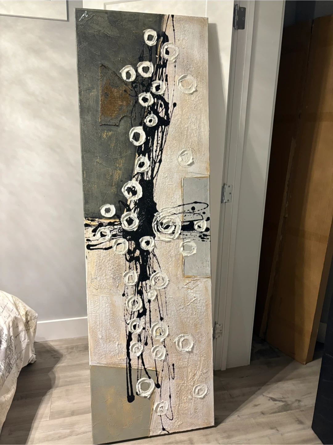 95Looking to add a unique touch to your space? This abstract wall art piece could be just what you need! It features a mix of textures and colours, with a striking design that's sure to catch the eye. It's in great condition and ready to hang in your home or office