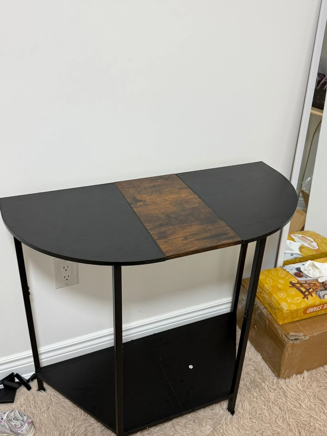Selling a console table with a sleek black frame and a wood-accented top. It's in great shape and would look lovely in an entryway or hallway. It also has a bottom shelf for extra storage!