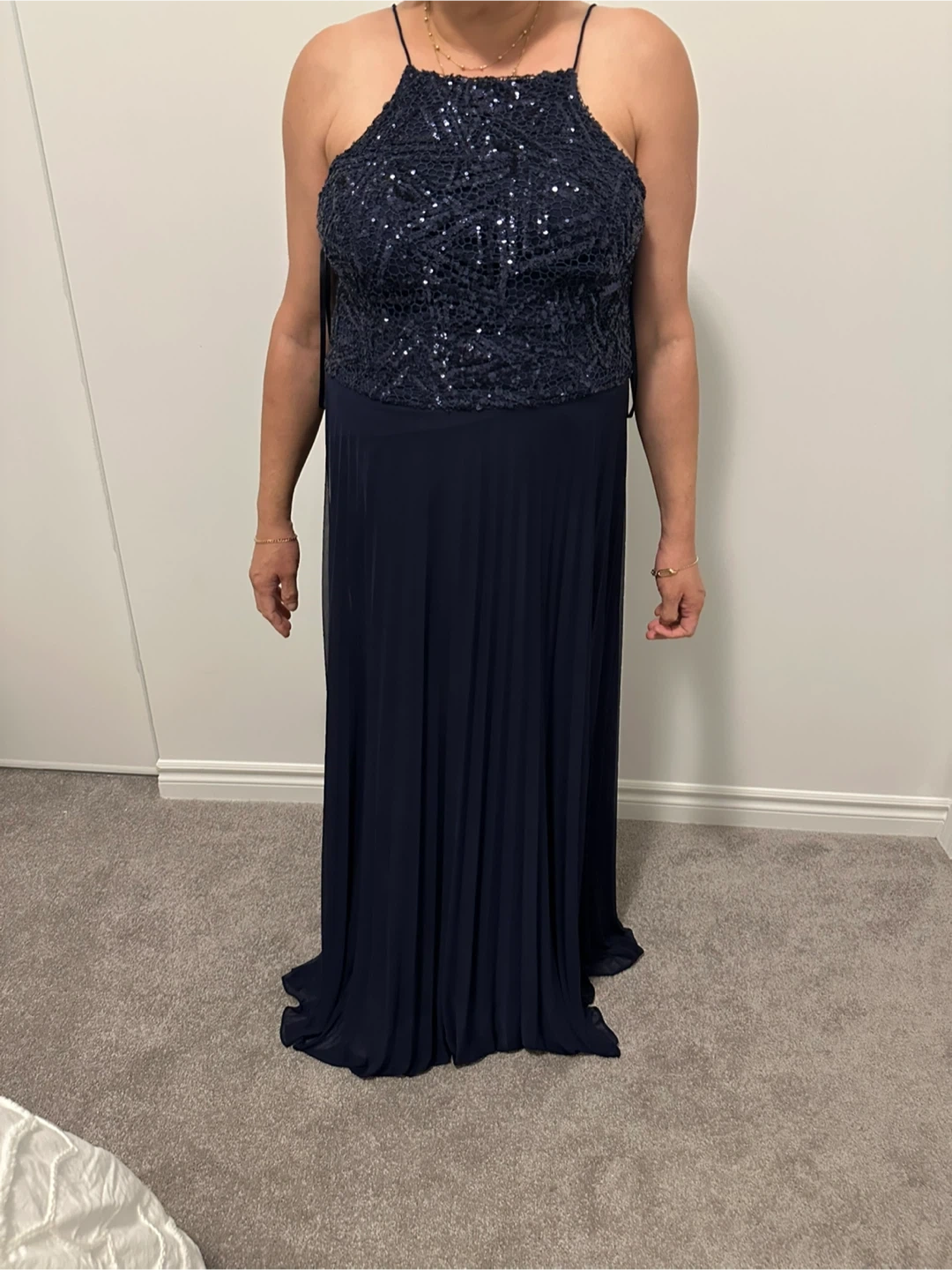 Selling a beautiful navy blue maxi dress with a sequin top. It's perfect for a special occasion! The dress features a flowing skirt and a sparkly sequin bodice, making it both elegant and comfortable. It's in great condition and ready for a new home