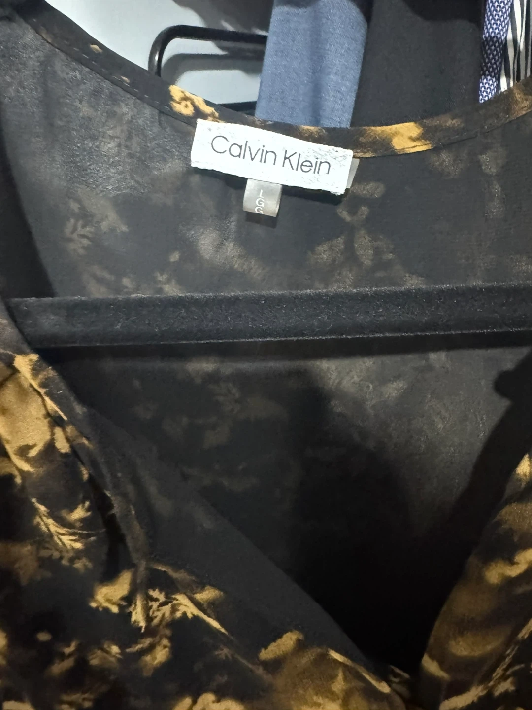 65Selling a Calvin Klein blouse in size L. It features a unique black and gold pattern. The blouse has a V-neck and button-up style. Perfect for a stylish and comfortable look!